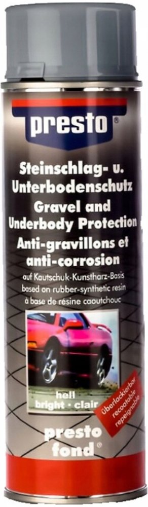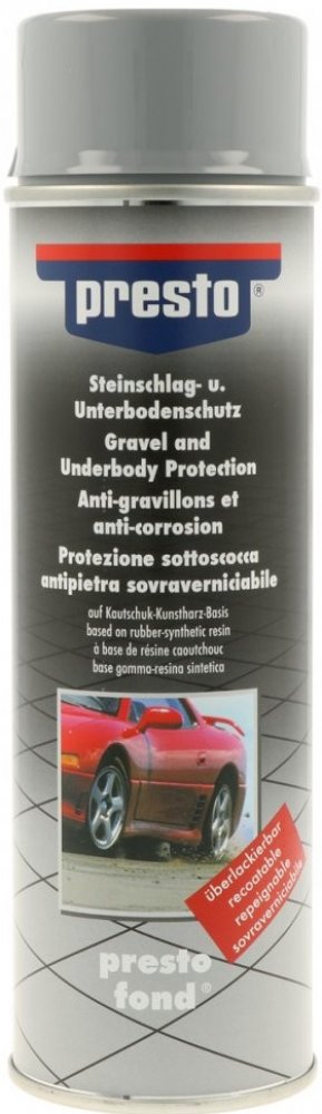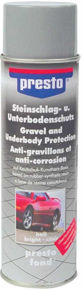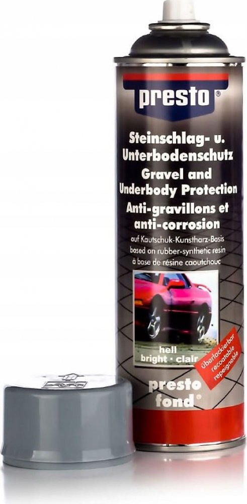 Ochranný prostředek značky Presto poskytuje ideální ochranu proti odletujícím kamínkům a korozi, a to na podvozku a viditelných dílech vašeho automobilu. Tento lak tvoří odolnou, elastickou ochrannou vrstvu proti dopadajícím kamínkům a je vhodný i jako prostředek potlačující hučení v podbězích kol a podlaze karoserie.