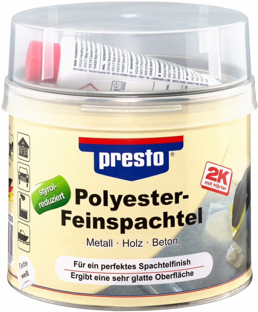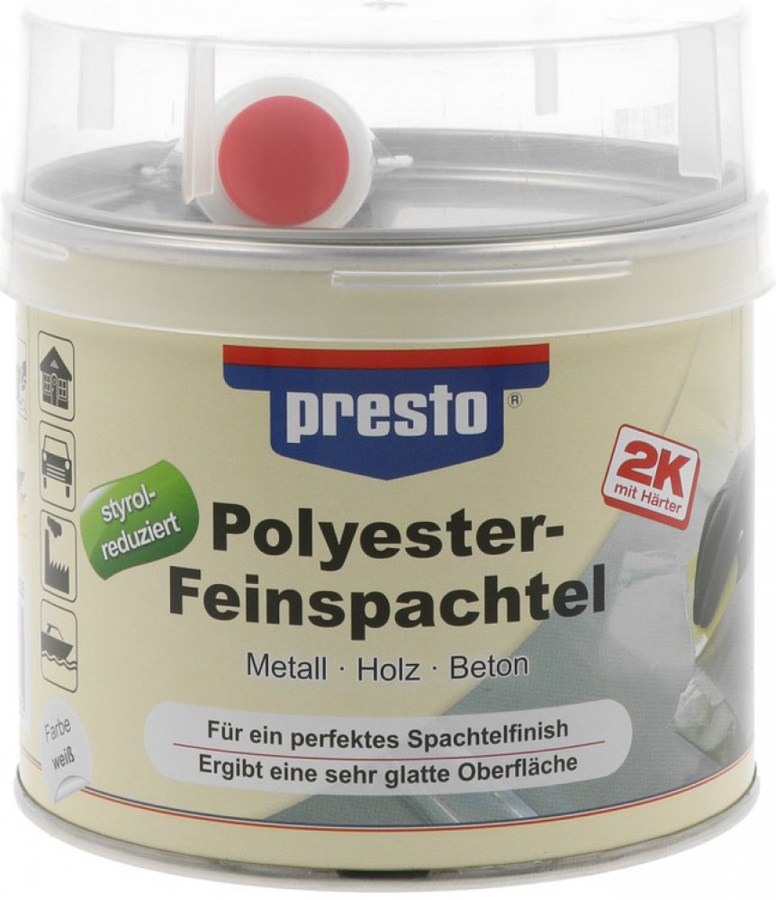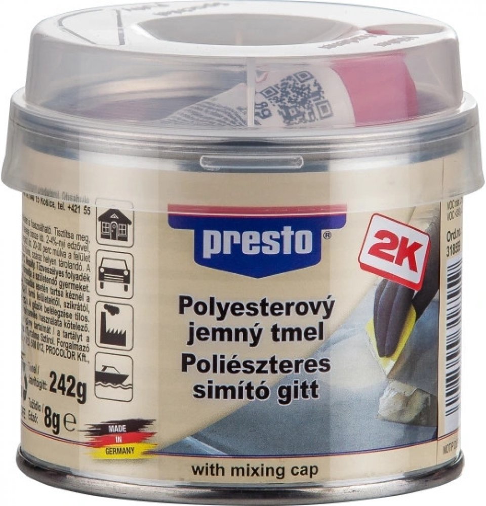 Jemný tmel presto flex je velmi elastický a trvale velmi dobře brousitelný. Za cca 30 minut lze vytmelenou plochu vrtat, brousit, řezat, pilovat i lakovat.
