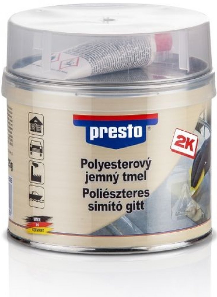 Vysoce elastický, rychle tvrdnoucí polyesterový jemný dvousložkový tmel, tvořený vysoce reaktivní, nenasycenou polyesterovou pryskyřicí, plněnou novou, mikrojemnou kombinací pigmentu a plniva.