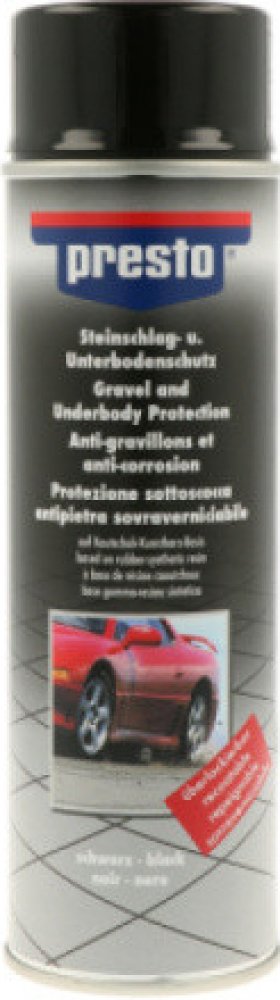 Ochranný nástřik sprej je ideální pro podvozky vozidel, včetně viditelných částí. Tvoří odolnou elastickou ochrannou vrstvu proti kamínkům. Je také vhodný pro použití jako tlumicí povrch podběhů a šasi. Příklady použití: Auta, karavany, nádrže, lodě, nákladní automobily, spoilery a prahy. Kvalita a vlastnosti: Černý Výborná antikorozní ochrana Tlumí zvuk Lze přelakovat nejčastěji používanými barvami (pro 2K laky doporučujeme povrch předem ošetřit základovou barvou presto Primer) Dlouhotrvající pružnost Vynikající přilnavost Návod k použití: "Většina barevných sprejů PRESTO mají takzvaný pojistný kroužek, nebo ochranné víčko, aby se zabránilo neoprávněnému použití. Viz odpovídající rady na víčku nebo na etiketě. Před použitím si pečlivě přečtěte a dodržujte varovné texty na etiketě!" Aplikace spreje: Nejlepších výsledků dosáhnete při pokojové teplotě Okolní plochu pečlivě zakryjte, aby nedošlo k jejímu postříkání. Doporučená vzdálenost nanášení: přibližně 30 cm. Před použitím nádobku důkladně protřepte po dobu nejméně 2 minut, čas od času protřepání zopakujte i během používání. Hojně naneste presto ochranu podvozku. Po použití otočte nádobku dnem vzhůru a stiskněte ventil, díky čemuž dojde k jeho vyčištění. Aplikace Kartuše stříkací pistolí: Nejlepších výsledků dosáhnete při pokojové teplotě. Produkt je připravený k použití, není nutné žádné ředidlo. Stříkací pistoli lze po aplikaci očistit bílým lihem. Bezpečnostní upozornění GHS02 - hořlavé látky GHS07 - dráždivé látky Signální slovo: Nebezpečí Obsah nebezpečných látek butyl-acetát kalafuna aceton ethyl-acetát EUH066 Opakovaná expozice může způsobit vysušení nebo popraskání kůže. H222+H229 Extrémně hořlavý aerosol. Nádoba je pod tlakem: při zahřívání se může roztrhnout. H317 Může vyvolat alergickou kožní reakci. H319 Způsobuje vážné podráždění očí. H336 Může způsobit ospalost nebo závratě. H412 Škodlivý pro vodní organismy, s dlouhodobými účinky. P101 Je-li nutná lékařská pomoc, mějte po ruce obal nebo štítek výrobku. P102 Uchovávejte mimo dosah dětí. P210 Chraňte před teplem, horkými povrchy, jiskrami, otevřeným ohněm a jinými zdroji zapálení. Zákaz kouření. P211 Nestříkejte do otevřeného ohně nebo jiných zdrojů zapálení. P251 Nepropichujte nebo nespalujte ani po použití. P260 Nevdechujte prach/dým/plyn/mlhu/páry/aerosoly. P264 Po manipulaci důkladně omyjte všechny zasažené čás