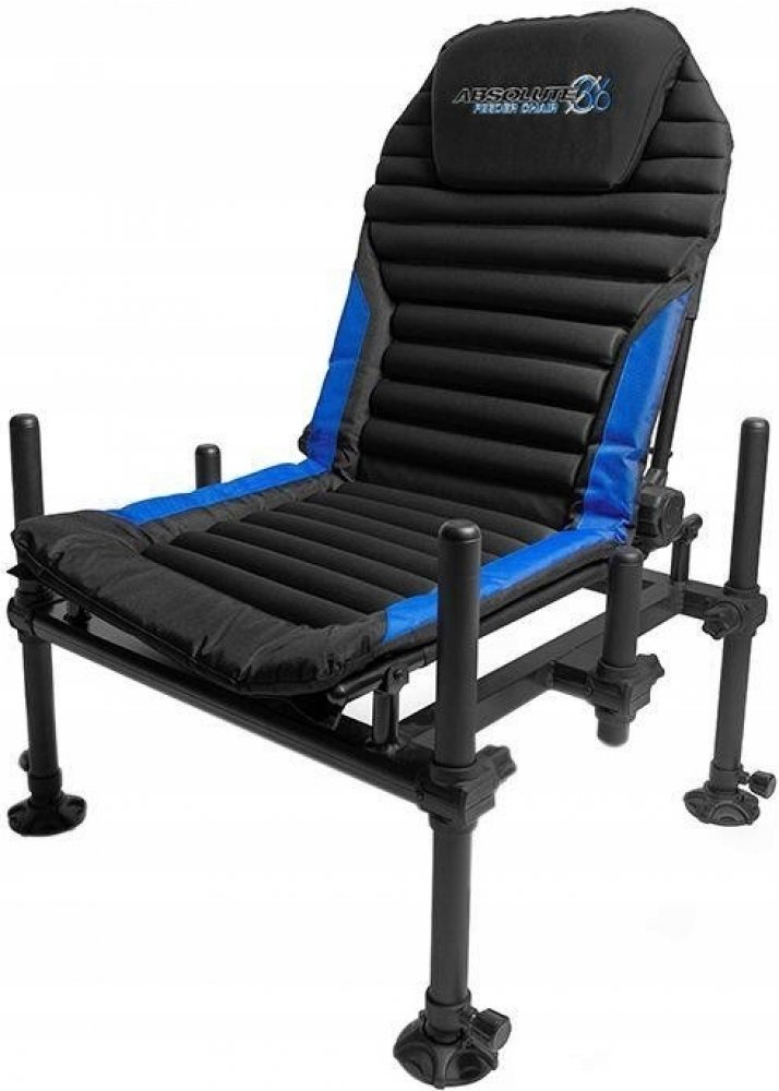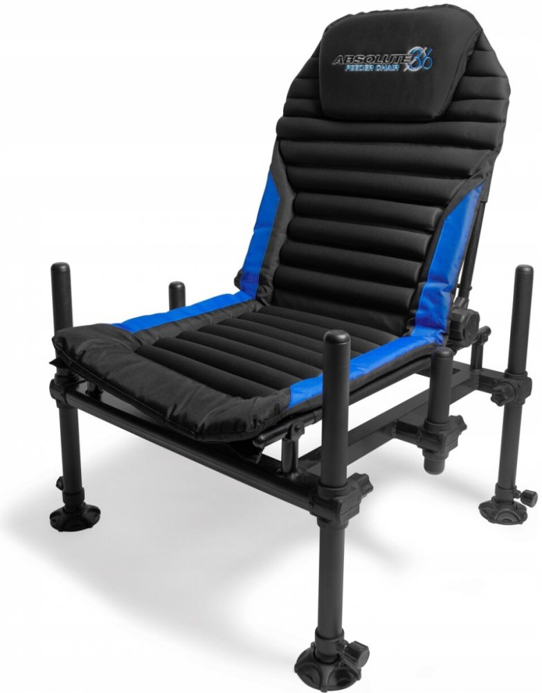 Křeslo Absolute 36 Feeder Chair má velmi pohodlnou matraci a je ideální pro dlouhé sezení u vody, přičemž ji lze snadno sbalit díky skládacímu opěradlu a odnímatelným nohám, které lze pomocí dodaných popruhů uložit v zadní části židle. Součástí balení je také popruh přes rameno pro přepravu.