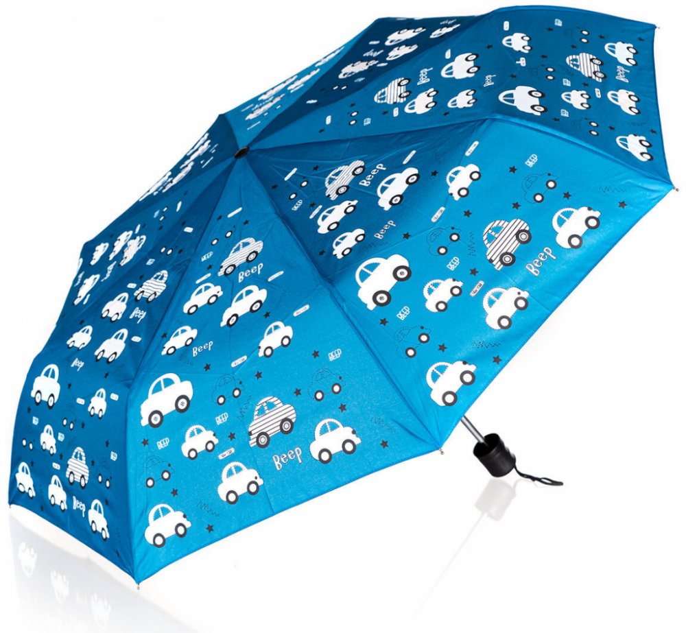 Skládací deštník v modré barvě s autíčky, slouží k ochraně proti dešti a přímému slunci.