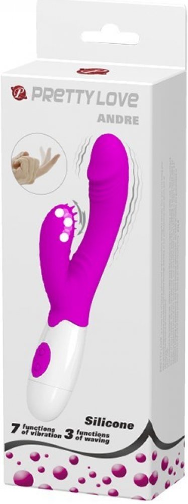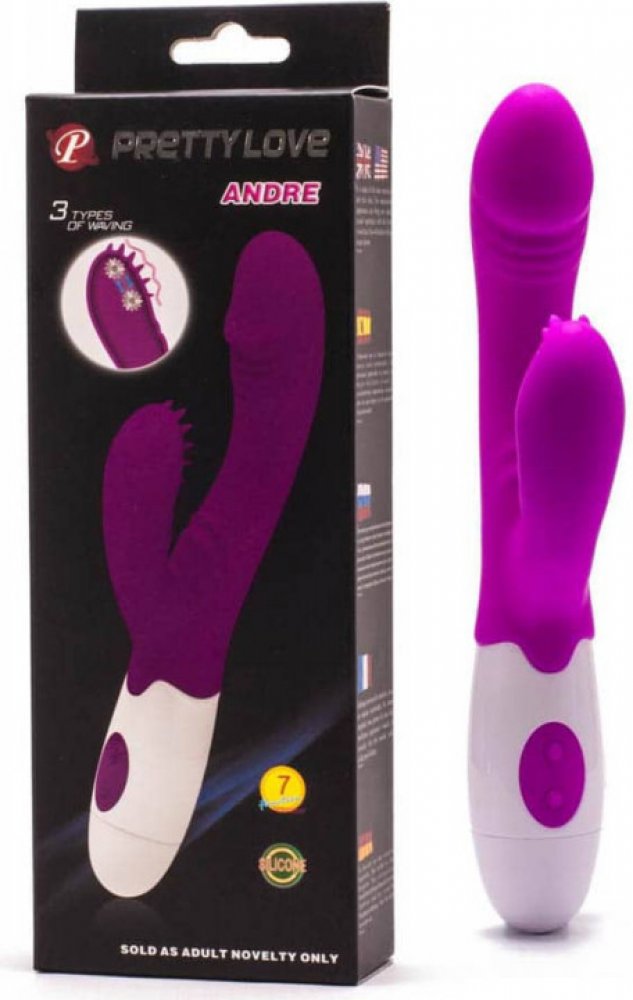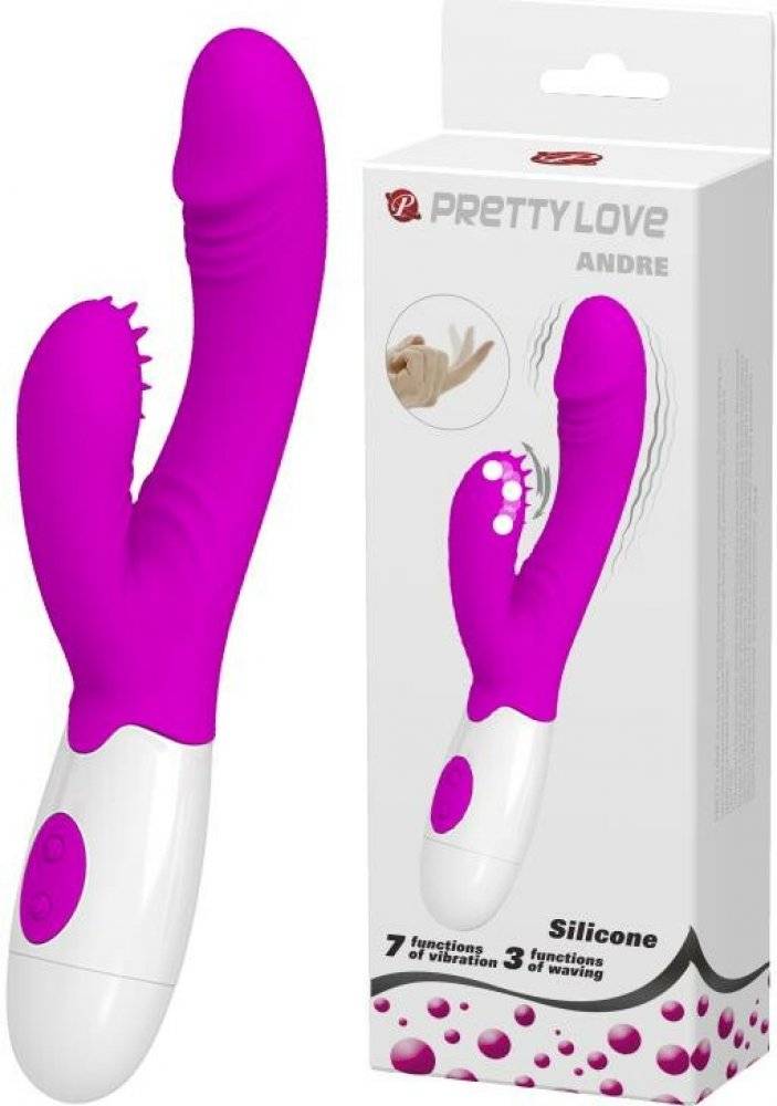 PrettyLove Andre-silikonový vibrátor s rozšířenou špičkou s malými bodlinkami a moderním ergonomickým tělem. Výhodou těchto vibrátorů je, že jsou osazeny dvěma motory a umožnují vaginální i klitorální stimulaci zároveň. Jeden - vibrační motorek je umístěn ve stimulátoru klitorisu, druhý - masážní motorek je umístěn na konci vibrátoru. Výkonné motory disponují 7stupni funkcí vibrací/pulsací, masážní motorek umístěný ve vibrátoru. Jeho tělo je vyrobené z hebkého silikonu a plastové rukojeti z netoxických materiálů. Ovládací panel je vybaven tlačítkem pro zapínání a vypínání a tlačítkem pro výběr intenzity vibrací. Délka 20,5 cm, průměr 3,3 cm. Materiál: ABS, lékařský silikon. Napájení 2x AAA.