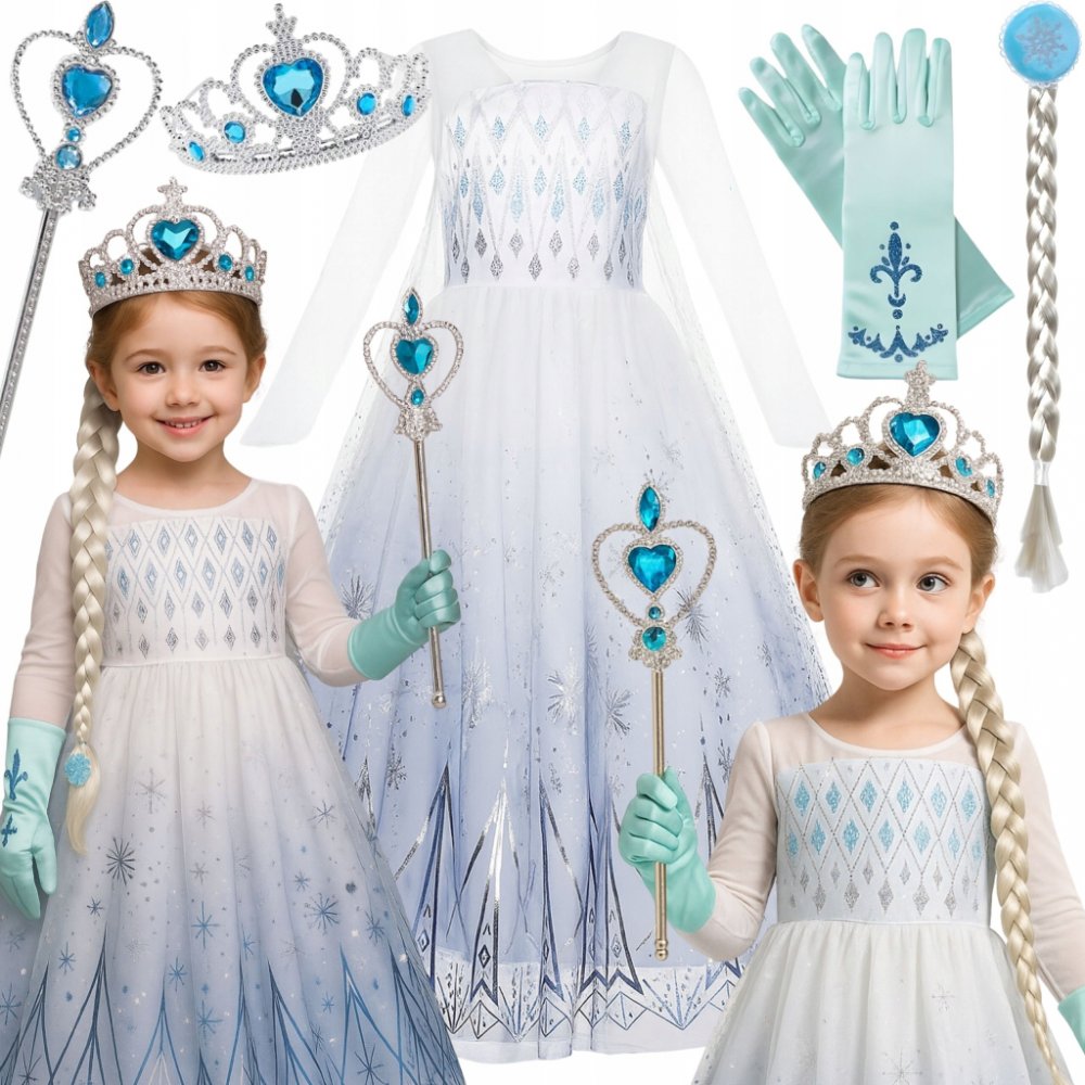 ❄ V sadě s: korunkou, žezlem, náhrdelníkem, náramkem, náušnicemi, prstenem a parukou.KOSTÝM ELSA❄ Specifikace kostýmu Elsy: