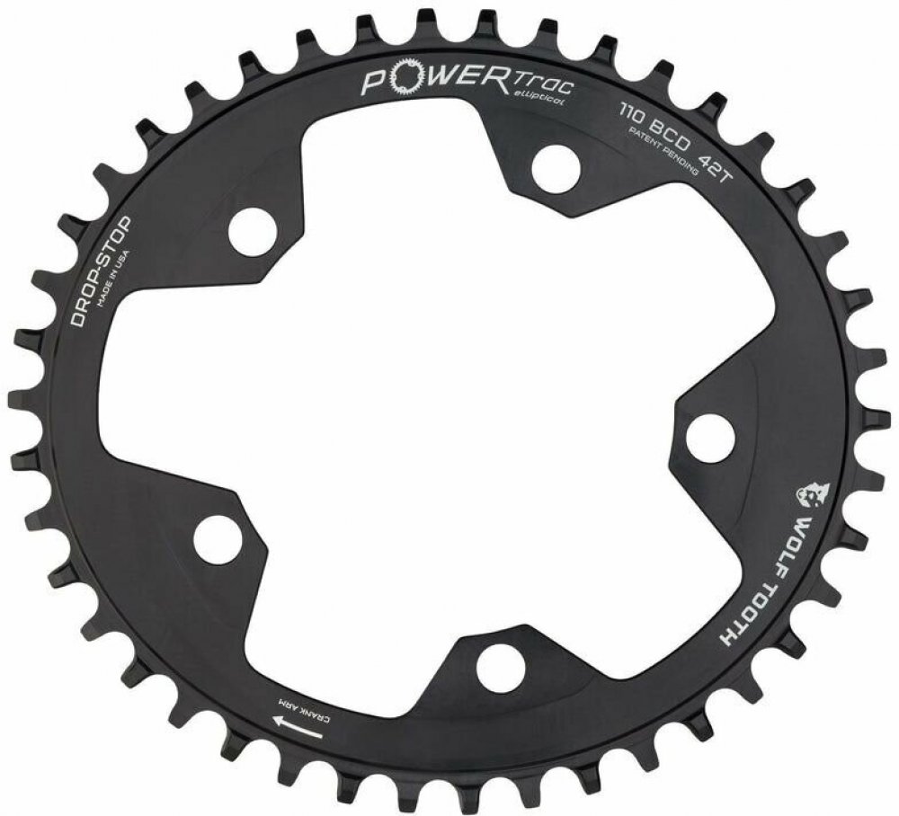 Převodník na kolo. Víc energie? Lepší trakce? Rozhodně! Méně řazení? Ano! Nerovnoměrný zdvih pedálu? Ne s převodníky Wolf Tooth PowerTrac Elliptical™ (PTE). Náš proprietární design znamená o něco méně oválný prstenec (10 %) s méně agresivním časováním (112°) než u konkurenčních verzí. Jakákoliv změna zdvihu pedálu je pro většinu jezdců nepostřehnutelná, ale stále poskytují výhody síly a trakce, které jsou vlastní oválným převodníkům. Je to jako mít dva převodníky v jednom! S eliptickými převodníky PowerTrac se část s větším průměrem zapojuje do řetězu v optimálním bodě spodního zdvihu neboli „Power Zone“ – mezi 1-5 a 7-11 na ciferníku –čímž využijete přirozené biomechanické síly těla: Například v této části je převodníkPTE 34t ekvivalentní kulatému převodníku 36t. Podobně v „zóně zotavení“ (11-1 a 5-7) se zapojí menší část převodníku PTE, čímž se maximalizuje účinnost v nejslabší části zdvihu pedálu a zde je PTE 34t převodník ekvivalentní 32t kruhovému převodníku. Výše uvedené navíc poskytuje hladší a účinnější otáčení pedálu, což znamená lepší trakci. Stabilnější točivý moment na zadním kole znamená méně protáčení v „Power Zone“, zatímco šlapání je snazší během „Recovery Zone“, takže si udržíte dynamiku. Kompatibilní pro použití s ??klikami 110 BCD 5 ramen. Na klikách, které mají 4 viditelné šrouby a 1 skrytý šroub za klikou, jako u SRAM, se klika otočí o 180 stupňů oproti normálu.