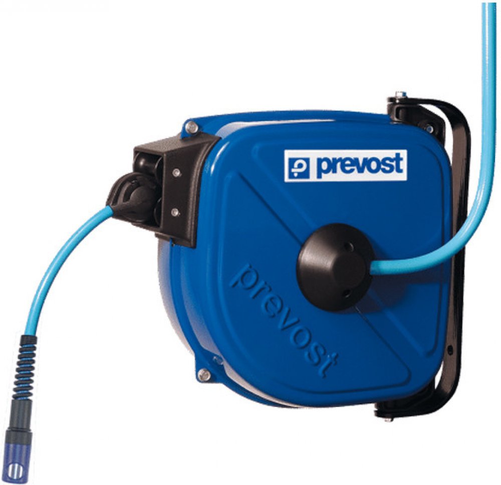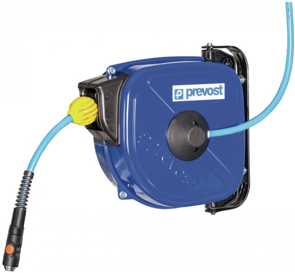 Hadicový naviják je vybavený tvrdou pružnou polyuretanovou hadicí s tkaninovým opletem. Pouzdro z pozinkované oceli s elektrostatickým povlakem odolným vůči UV záření, ocelová pružina.Otočný držák o 180°, možnost montáže na zeď nebo na strop.Přívod vzduchu: připojen k rotační 360° spojce ve středu pouzdra.Součástí dodávky je přívodní hadice 1 m.Konec hadice je vybaven bezpečnostní rychlospojkou Prevo S1 ESI, která poskytuje ochranu proti „vystřelení“ hadice a umožňuje odtlakování a odpojení pneumatického nářadí jedním stisknutím tlačítka.