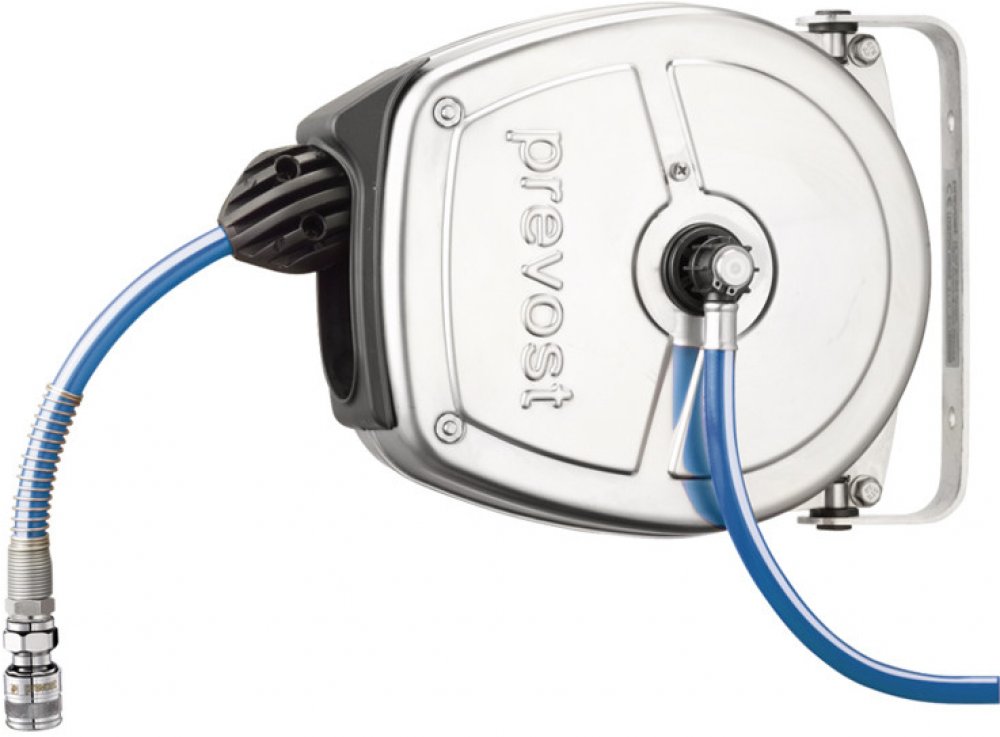 Hadicový naviják je vybavený polyuretanovou hadicí s se specifickým opletem, který odolává teplu a vlhkosti. Pouzdro je vyrobeno z nerezové oceli AISI 304 (1.4301) s elektrostatickým povlakem odolným vůči UV záření, ocelová pružina. Otočný držák o 180°, možnost montáže na zeď nebo na strop. Součástí dodávky je přívodní hadice 1 m.