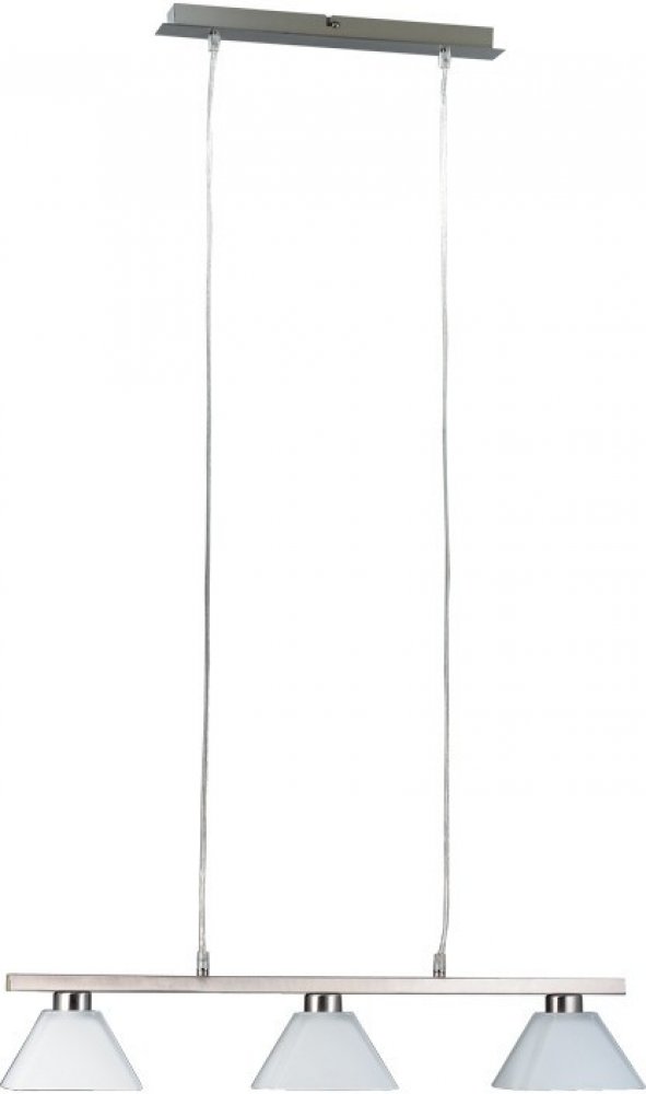 Závěsné svítidlo SYDNEY z kolekce designového osvětlení slovenského dodavatele LUXERA je ideálním osvětlením nad jídelní stůl nebo kuchyňskou linku. Kvůli nižšímu krytí IP20 není vhodné do koupelny a místností s výskytem vyšší vlhkosti vzduchu. Hranatá základna a tenký rám svítidla o délce 70 cm jsou vyrobeny z kovu v saténově niklové barvě. Rám je zavěšený na dvou lankách, jejichž výšku lze nastavit až do délky 121 cm, a jsou na něm umístěny 3 skleněné difuzory v matně bílé barvě. Ty jsou osazeny paticemi E14 o maximálním příkonu 3 x 40 W (zdroje nejsou součástí balení). Svítidlo je napájeno ze sítě na 230V a je nutné jej umístit minimálně 0,5m od osvětlovaného objektu. Vztahuje se na něj záruka 2 roky.