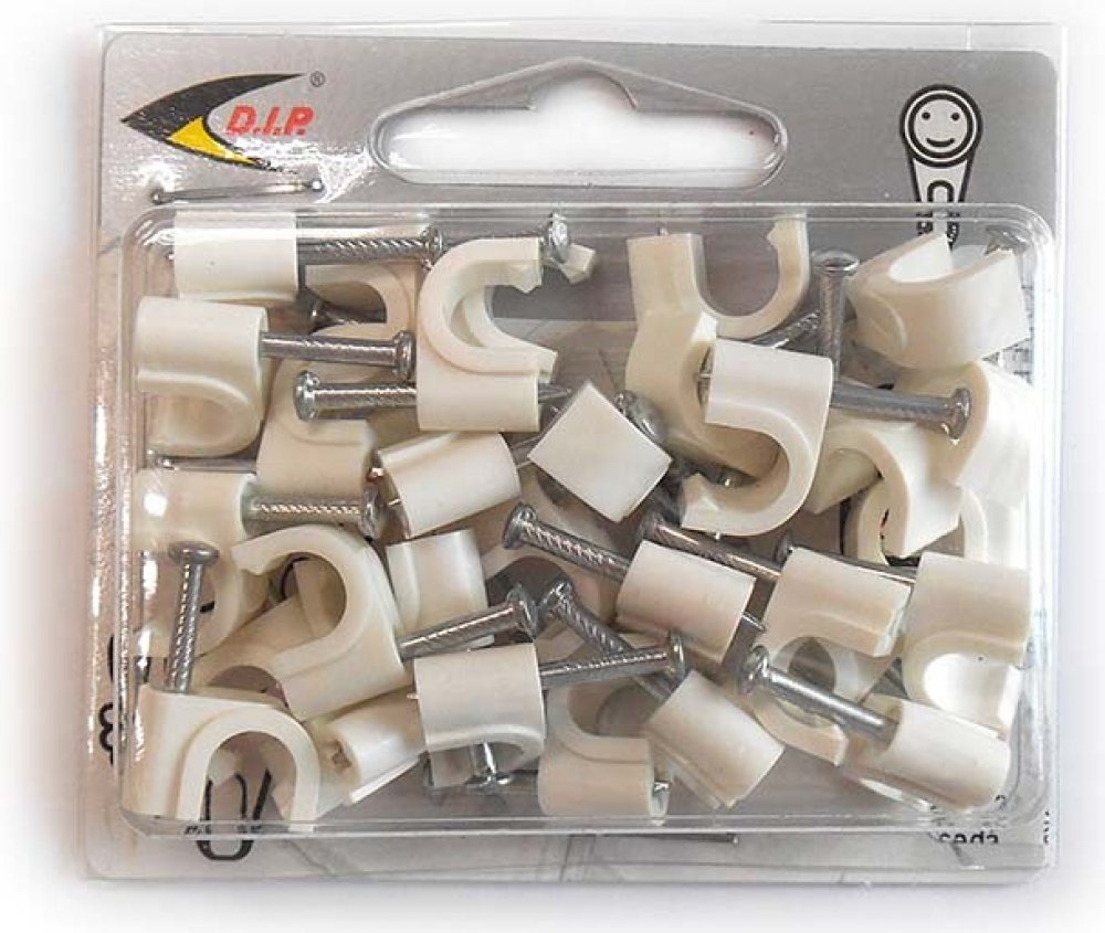 Kabelová příchytka kruhová, vel. 7, bílá - 30 ks v blistrus předmontovaným kaleným zinkovaným hřebem