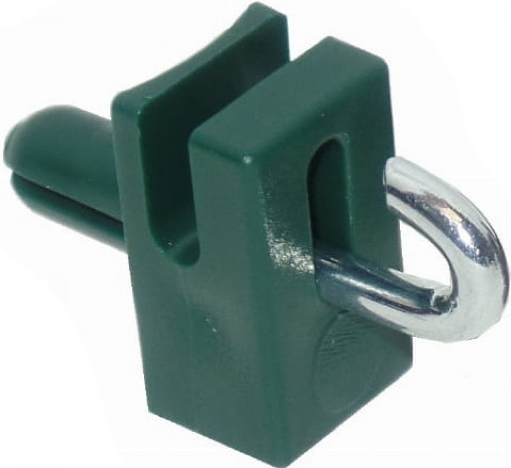 Univerzální plastový držák pletiva s trnem pro upevnění napínacího drátu do průměru 4,5 mm. Je vyroben z vysoce kvalitního PVC, které je barevně slaně a odolné vůči UV záření. Barva zelená.