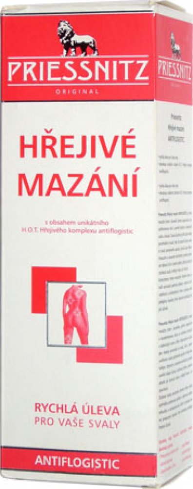 Priessnitz Hřejivé mazání ANTIFLOGISTIC je přípravek s unikátním složením - H.O.T. Hřejivým komplexem antiflogistic. Obsahuje směs éterických a aromatických složek, především kafr a kapsaicin, které zajišťují hřejivý a mírně znecitlivující účinek. Další složka - boswellia - pak působí příznivě při zánětech a celkově uvolňuje postižená místa.