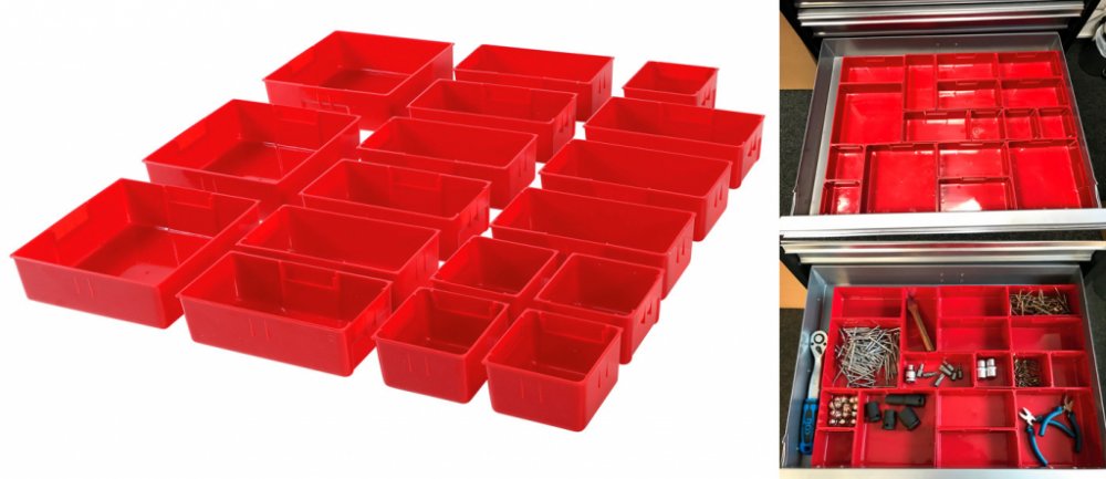 vhodné pro všechny dílenské vozíky BGS vhodné pro malé díly, šrouby, hadicové spony a další podnosy lze do zásuvky vložit mnoha způsoby přední strana s vloženou plochou pro indexovou mapu rozsah dodávky: 5 plastových táců 70 x 70 x 45 mm 9 plastových podnosů 145 x 70 x 45 mm 3 plastové podnosy 145 x 145 x 45 mm Technické parametry