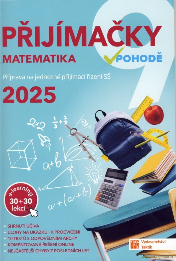 Cvičebnice Přijímačky v pohodě 9 - matematika obsahuje materiály pro komplexní přípravu na Jednotou přijímací zkoušku na střední školy se studiem ukončeným maturitní zkouškou. Příručka obsahuje 7 testovacích okruhů. Každý okruh se skládá ze shrnutí učiva, dvojic řešených a neřešených úloh. Následují vypracované úlohy, ve kterých se v minulých letech nejvíce chybovalo s radami, jak se chybám vyhnou...