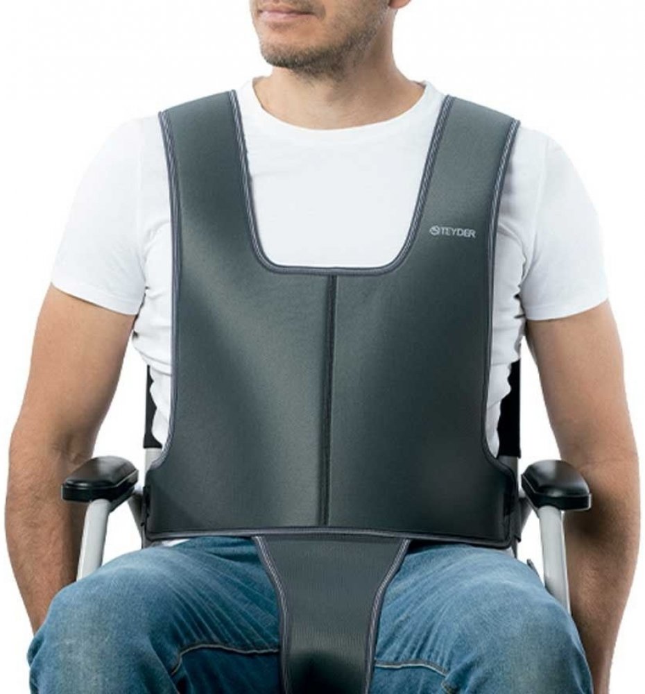 Umístěte vestu kolem břicha a poté spodní popruhy veďte kolem pasu až za opěradlo židle nebo křesla. Přetáhněte popruhy přes ramena až k zapínání a při spínání se pro správné umístění řiďte barevnými značkami na popruzích. Zatažením za konce popruhů nastavíte jejich upnutí. Poté veďte perineální popruh mezi nohami, protáhněte ho otvorem mezi opěrkou a sedákem až ke spínání, pokud to typ sedáku umožňuje; pokud ne, obtáhněte sedák zvenčí. Při spínání perineálního popruhu se řiďte barevnými značkami a poté ho utáhněte na požadovanou míru.