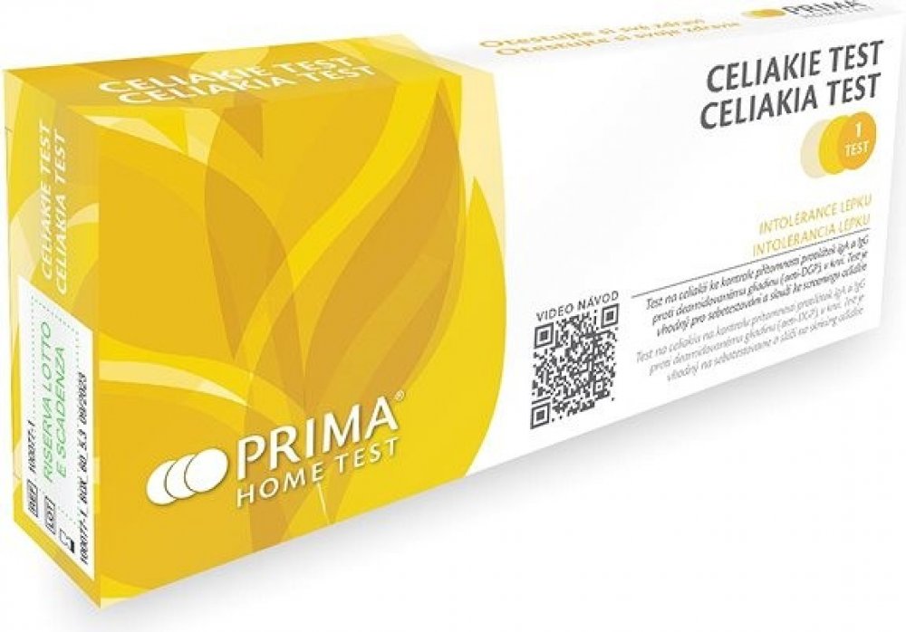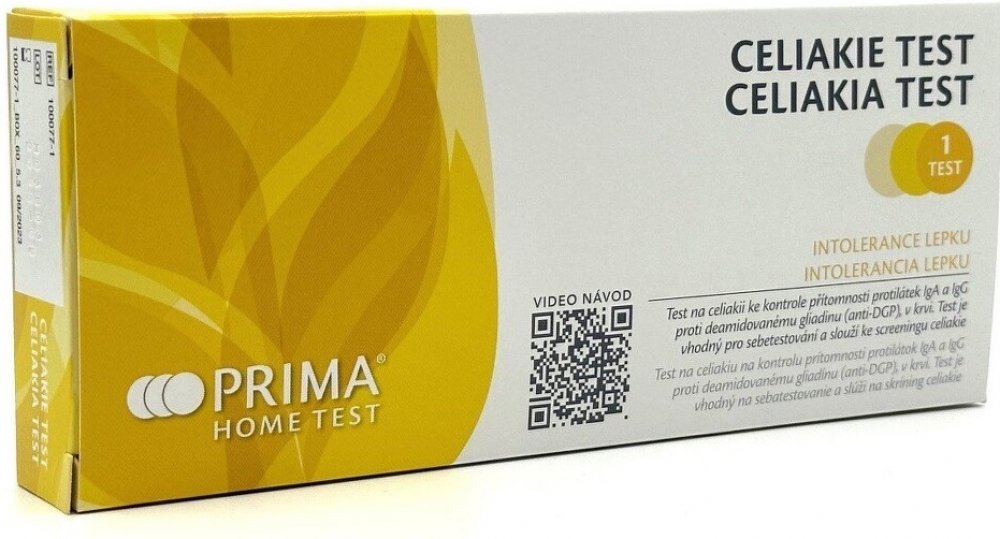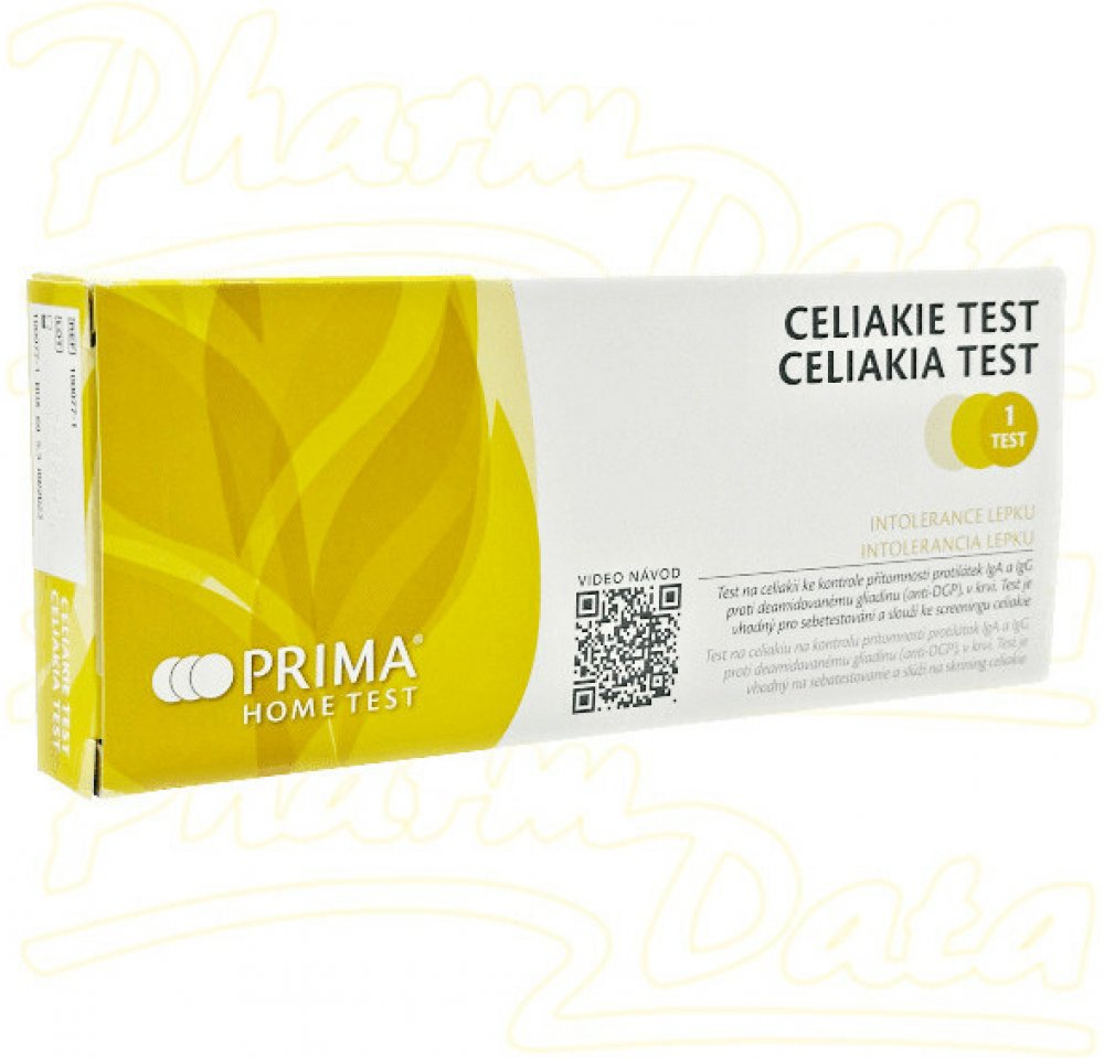 Princip testu:Test na celiakii je imunochromatografický test na detekci IgA a IgG protilátek proti deamidovanému gliadinu. Jestli jsou tyto protilátky přítomné ve vzorku v koncentraci nad 20 U/mL, dáva test pozitivní výsledek. Výsledek se odečítá vizuálně, bez použití přístroje. Relativní specificita testu je 94,1%, relativní senzitivita je 81,25% a přesnost je 90,0%. Test obsahuje všechny komponenty potřebné k testování. Další údaje a přesný postup testování - viz příbalový leták.