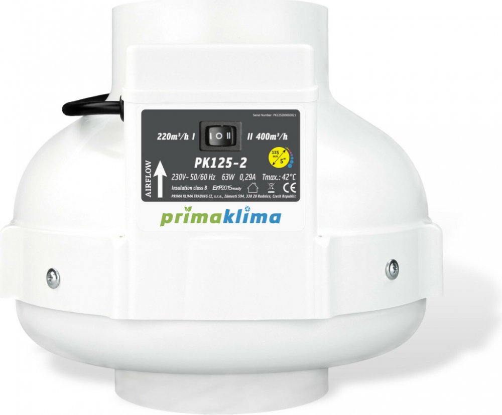 Vysoce kvalitní radiální ventilátor Prima Klima PK125 MES-2 umožňuje měnit rychlosti a výkon (220 nebo 400m3h) jedním stiskem tlačítka. Širší využití ventilátoru oceníte například v různých ročních obdobích nebo při řešení celodenního provozu v režimu den/noc. Nespornou výhodou tohoto plastového ventilátoru je prémiový švýcarský motor, v Evropě vyráběné komponenty a tradičně bezchybné německé zpracování. V oblasti hlučnosti nemají tyto ventilátory Prima Klima dlouhodobě konkurenci. I při vysokém výkonu se chlubí tichým chodem. Vhodný do menších prostor. Kvalitní a spolehlivé motory MES se zpětně tvarovanými oběžnými koly poskytují až o 15% větší ventilační výkon než standardní ventilátory. Kabeláž je nutno přikoupit. Parametry ventilátoru Prima Klima PK125 MES-2: