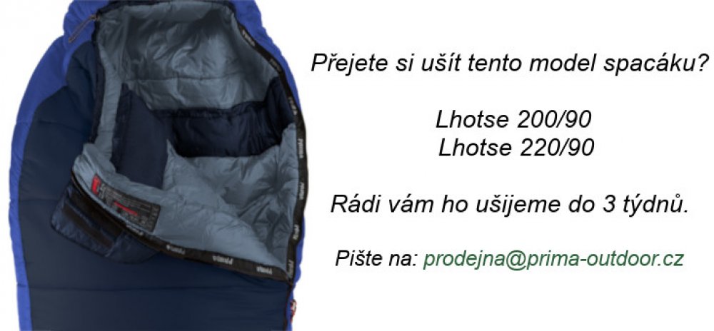 Spacáky PRIMA Classic Lhotse jsou kvalitně ušité českými švadlenami. Mají klasický tvar, tedy přední a zadní díl. Jsou ušity z klasických kvalitních "spacákových" tkanin, které běžně používají ostatní výrobci spacáků nejvyšších tříd. Jsou dvoubarevné, první barva je na vnější straně a druhá je uvnitř. Šijeme několik barevných kombinací. Zip je dvoucestný samosvorný a 100% spolehlivý YKK vyrobený v...