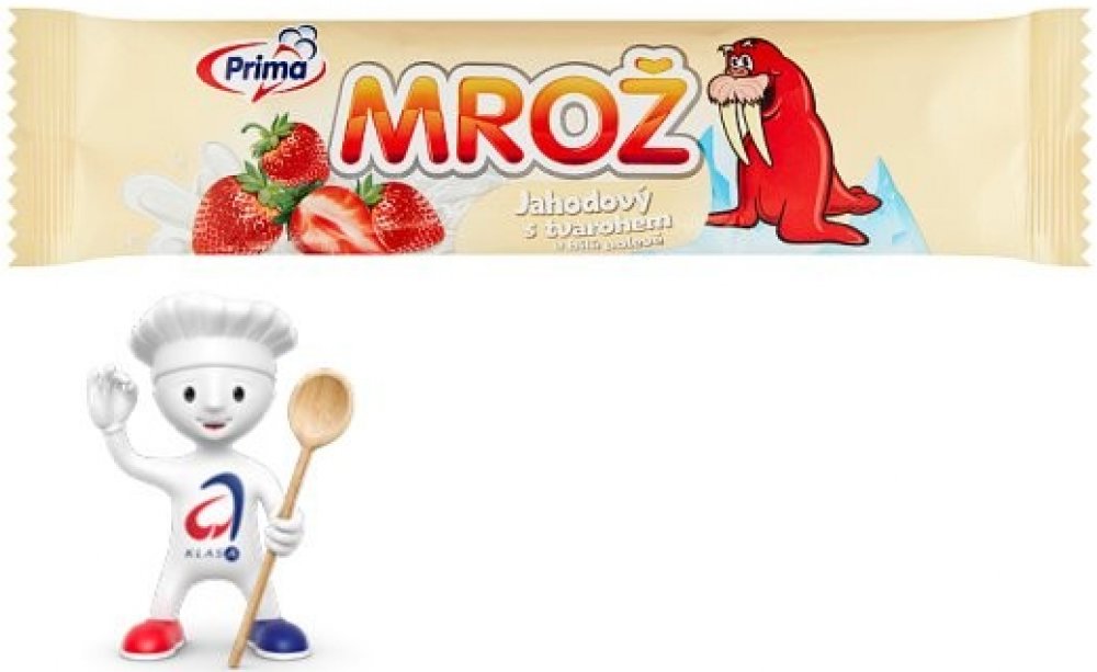 -- Mrož je jedna z našich nejoblíbenějších zmrzlin, v této podobě zahalená do bílé polevy. Za jeho typickou chuť vděčíme porci českého tvarohu zjemněného smetanou a více než 50% pečlivě vybraných vyzrálých jahod. Chuť jahod je to nejdůležitější, proto do Mrože vybíráme pouze některé odrůdy. Jahody musí být vyzrálé, sklizené v červnu a rychle zpracované. To proto, aby zmrzlina neztrácela svoji chuť a barvu.
