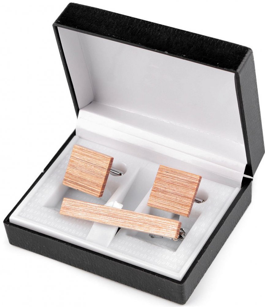 Manžetové knoflíky s kravatovou sponou v dřevěném provedení skvěle ozdobí každého muže. Dřevěný dekor stylově vynikne na manžetách košile i kravatě.
