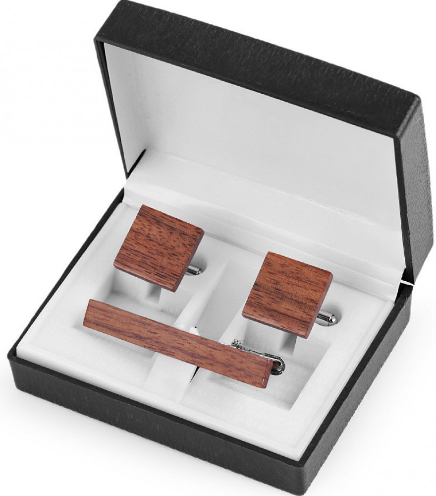 Manžetové knoflíky s kravatovou sponou v dřevěném provedení skvěle ozdobí každého muže. Dřevěný dekor stylově vynikne na manžetách košile i kravatě.