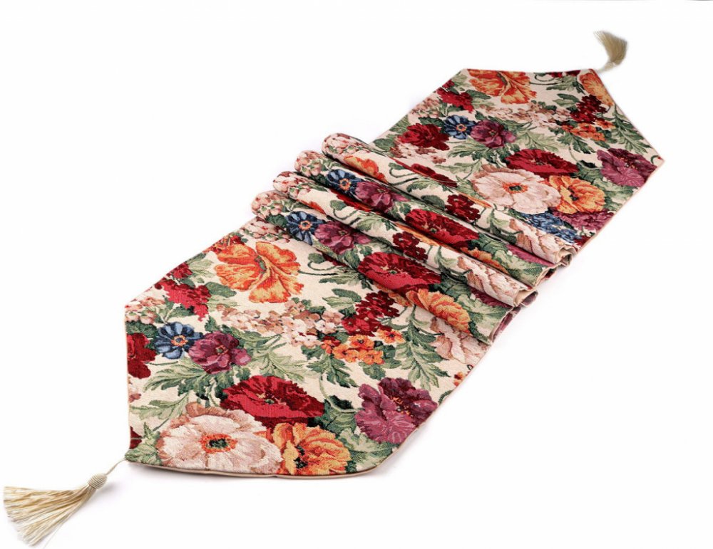 Textilní běhoun působí jako by byl vyšívaný gobelínovým stehem. Poslouží k ozdobení středové části stolu. Se svými květinovými motivy se hodí pro celoroční použití. Můžete jej použít na jídelní stůl pro vytvoření útulné atmosféry při večeři s rodinou nebo přáteli, je rovněž skvělou volbou pro sváteční stůl při oslavách, kdy dodá interiéru slavnostní vzhled. Na obou koncích má našitý lesklý střapec...