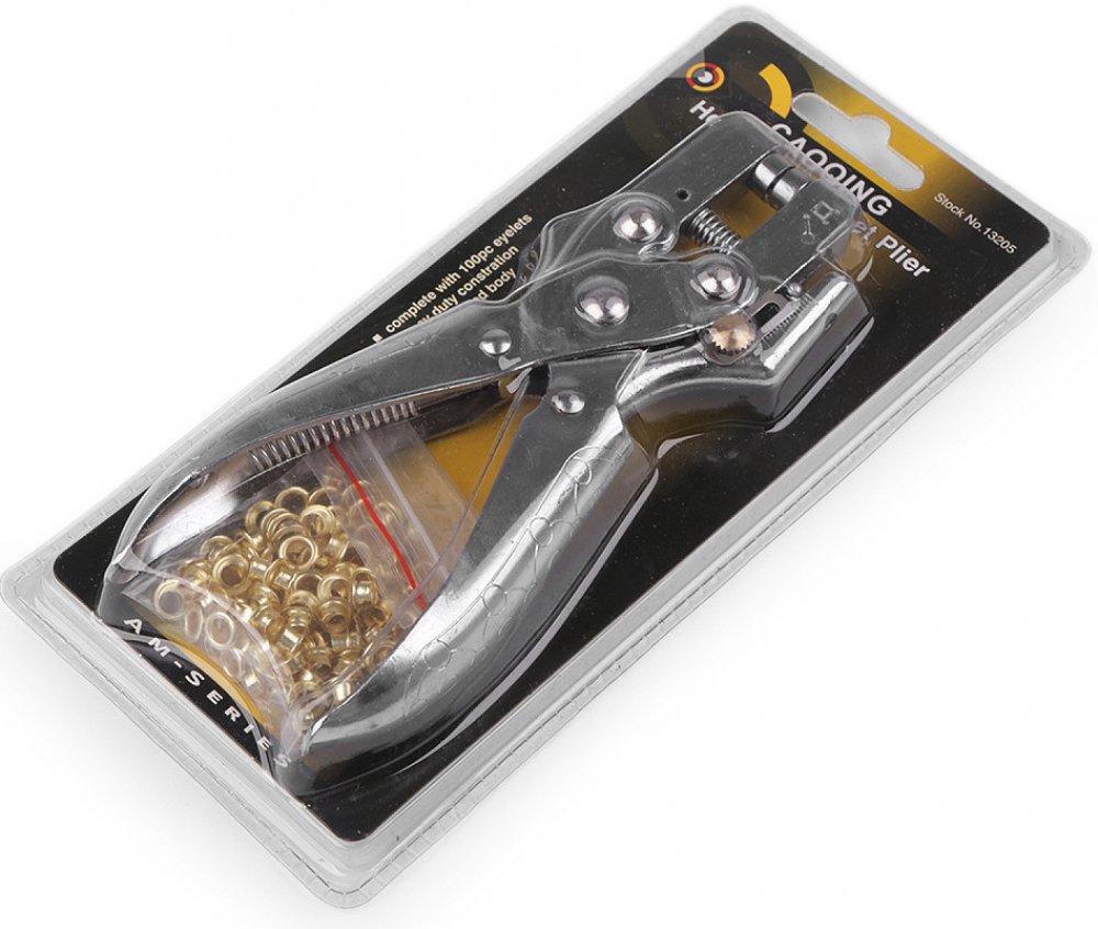 Návod k použití: Před použitím povolte bezpečnostní pojistku. Na podkladu vytvořte dírku, do ní vložte průchodku. Podklad s průchodkou vložte do kleští a kleště zmáčkněte.