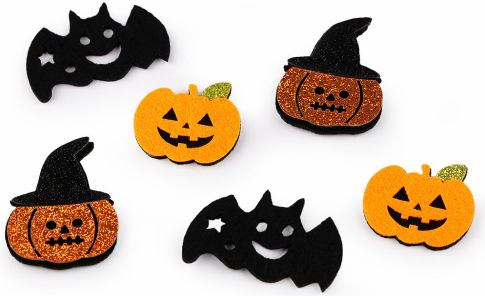 Ozdoby z filcu / plsti se hodí k přišití i nalepení. Některé detaily mají dozdobené glitry. Využijete je v mnoha výtvarných technikách, skvěle se hodí na tvoření s dětmi. Mohou se stát i milou ozdobou na Halloween, stačí je rozprostřít na stůl.