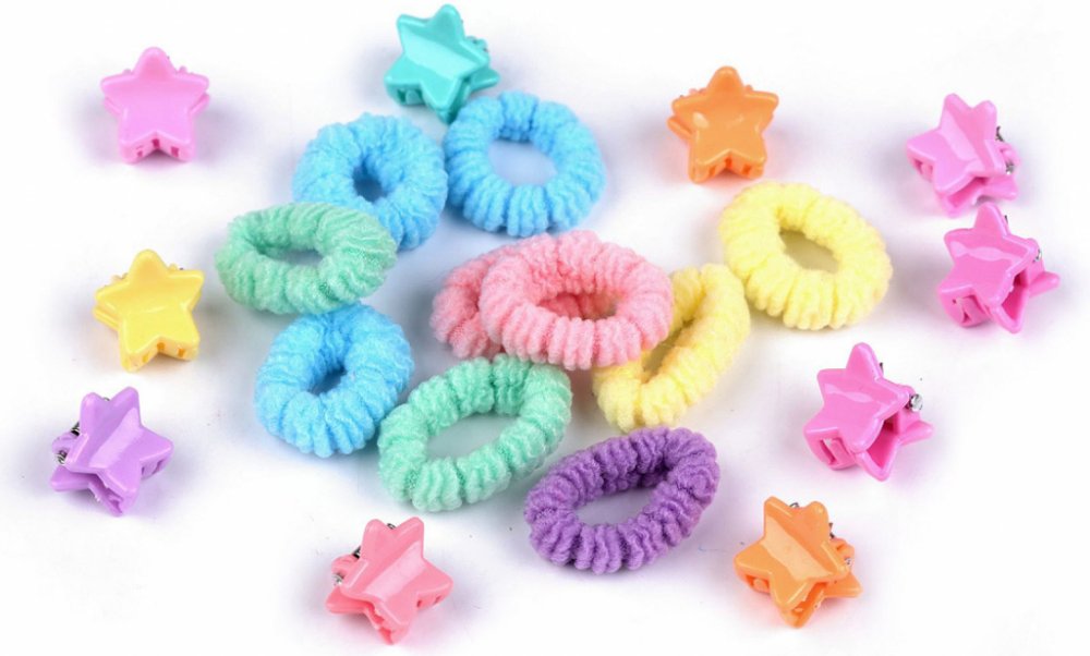 Sada barevných sponek skřipců a gumiček je velmi oblíbená. Dívky si mohou se skřipečky sepnout malé pramínky jemných dětských vlásků.