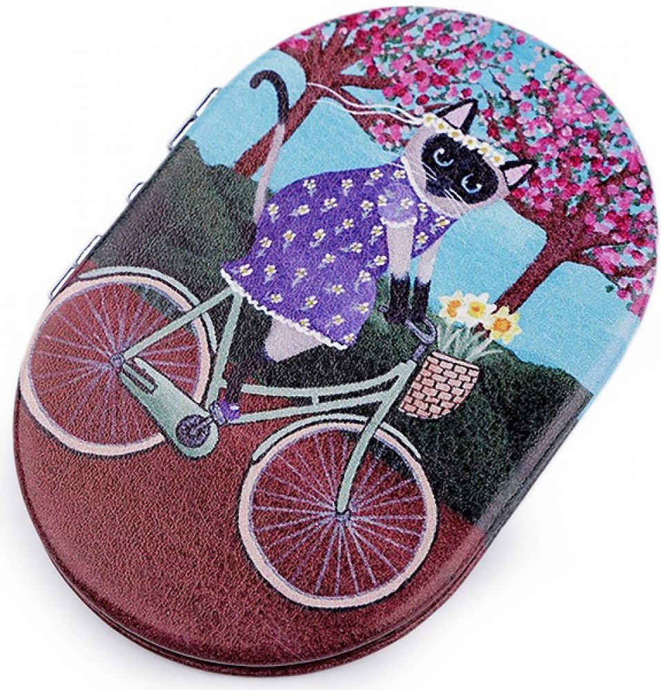 Otevírací zrcátko s potiskem kočky na bicyklu se hodí pro opravu make-upu kdykoliv během dne.