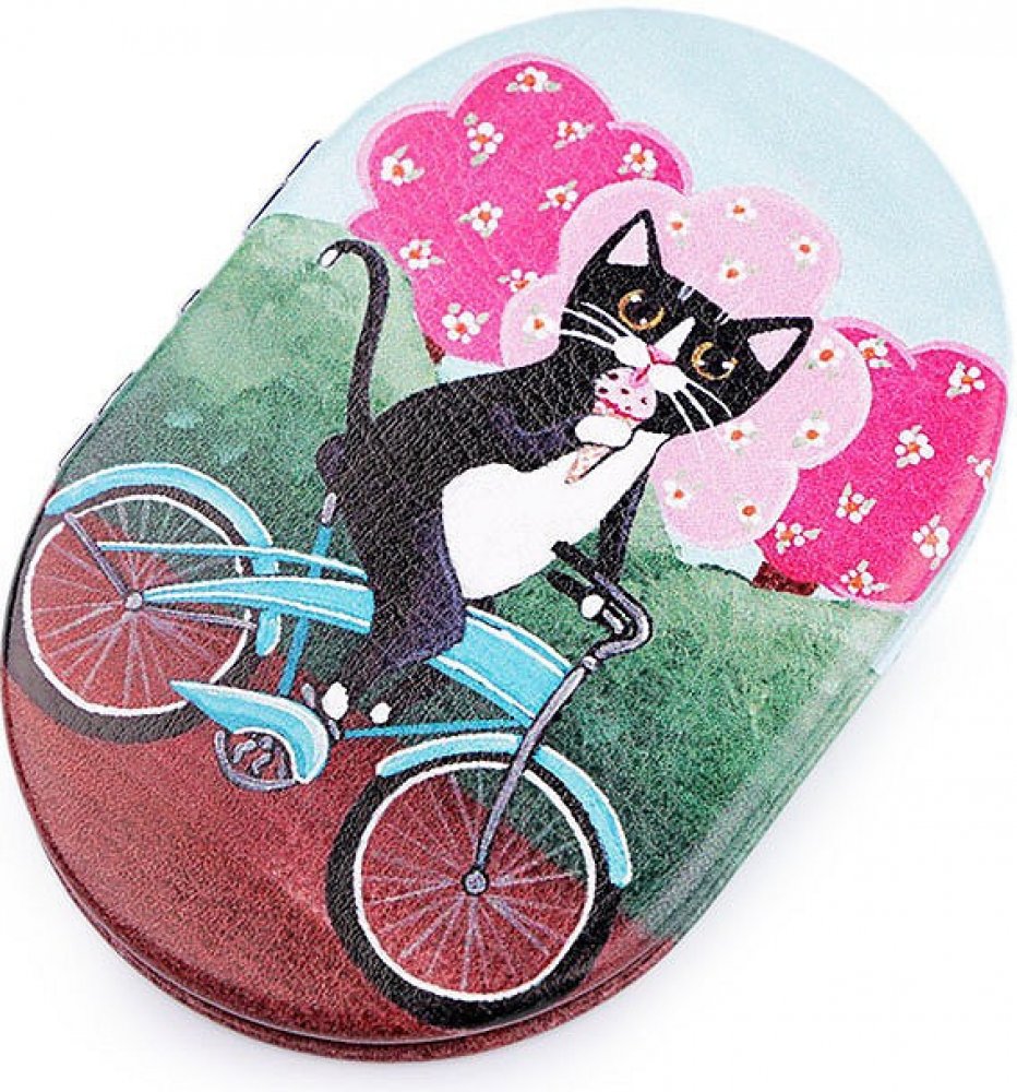Otevírací zrcátko s potiskem kočky na bicyklu se hodí pro opravu make-upu kdykoliv během dne.