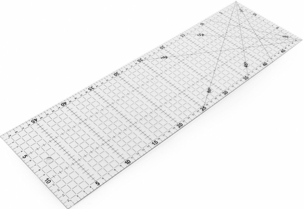 Velké plastové pravítko oceníte pro jeho univerzálnost. Je pevné, dá se využít nejen na techniku patchwork, ale i na další ruční práce jako jsou quilting, scrapbooking a šití. Vyznačené jsou hodnoty po půl cm a úhly 30°, 45° a 60°.