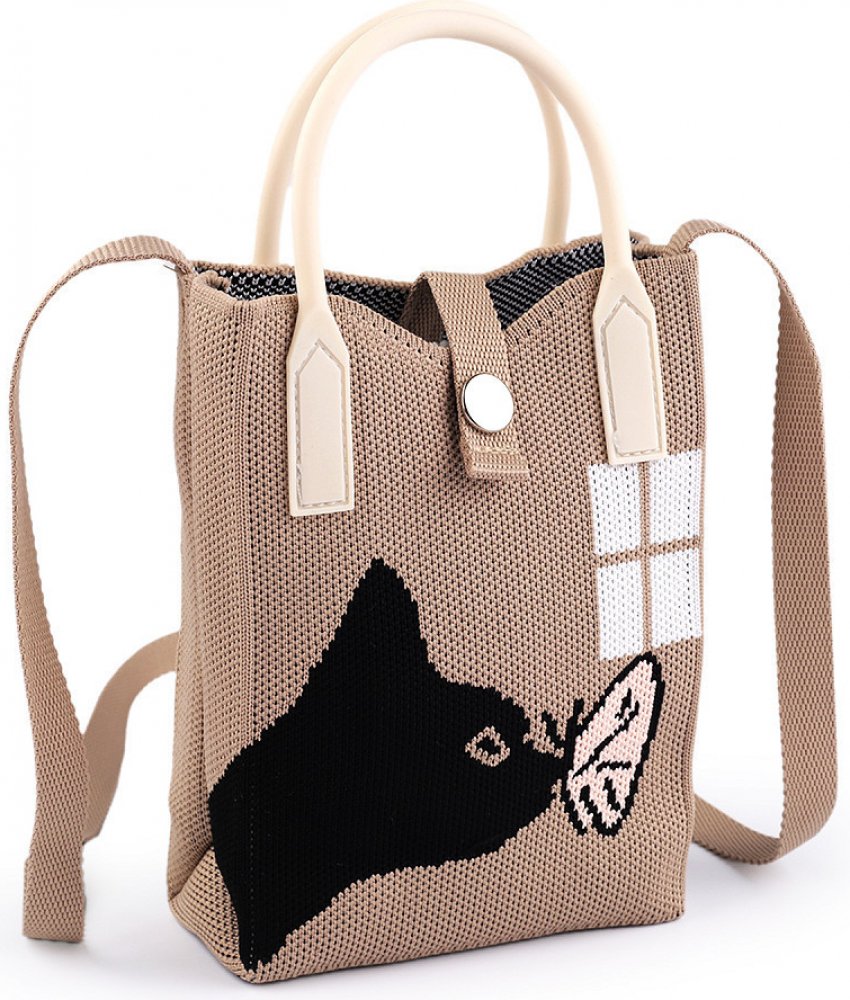 Malá kabelka s designem roztomilé kočky potěší všechny dívky. Je zajímavá svým pleteninovým materiálem, který je pevný. Taška se uzavírá pomocí poutka s patentem. Má dvě silikonová ucha a textilní popruh, dá se nosit v ruce i jako crossbody přes rameno či do kříže.