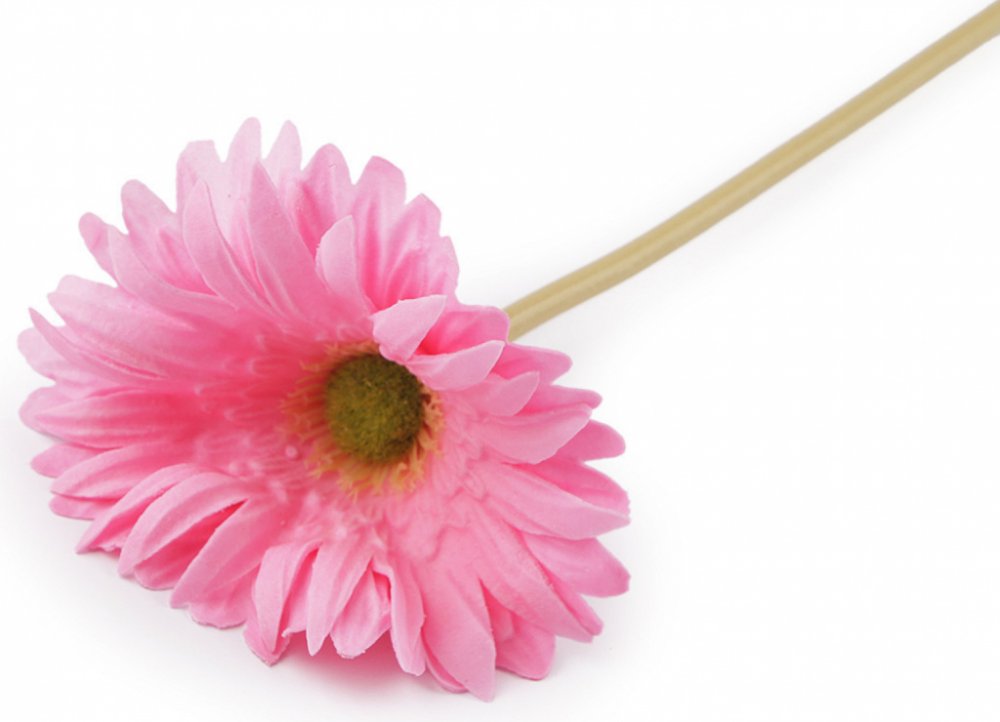 Umělá gerbera s dlouhým stonkem vypadá jako živá. Má kvalitně vypracované detaily. Ve stonku má drát, dá se tvarovat.