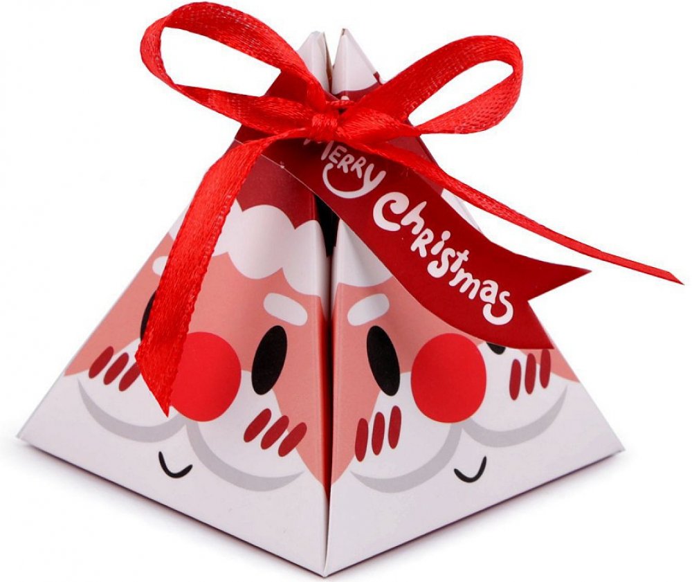 Vánoční krabička pyramida zaujme děti i dospělé. Nahoře se ozdobně zavazuje pomocí přiložené stužky. Součástí balení je i přivazovací vlaječka Merry Christmas. Krabičku můžete použít na drobné dárky nebo ji naplnit dobrotami na Mikuláše.