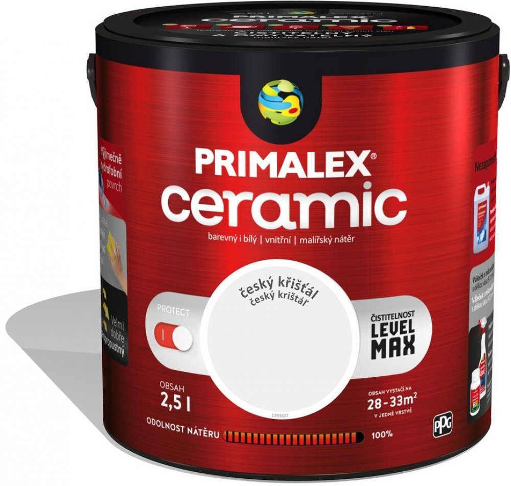 PRIMALEX ceramic bílý | barevný interiérový nátěr je revolučná, omyvatelná interiérová barva na zeď prvotřídní kvality, která je mimořádně odolná vůči skvrnám, nečistotám a důkladnému čištění. Kombinace vysoce kvalitní disperze a inovativních hydrofobních složek zabraňuje průniku nečistot do hloubky a vytváří tak povrch blížící se svou odolností a čistitelností keramickým povrchům, a to při zachování vysoké paropropustnosti. Běžné i problematické skvrny, které se mohou objevit na stěnách např. od kečupu, hořčice, kávy nebo červené víno lze tak velmi jednoduše odstranit. Při čistění nedochází k oděru barvy a povrch si udržuje elegantně matný a stálobarevný vzhled.