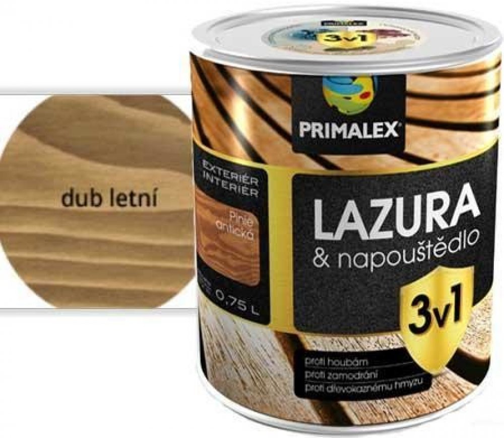 Primalex LAZURA & NAPOUŠTĚDLO 3v1 je určena k dekoračním vrchním nátěrům dřeva především pro venkovní prostředí. Lazura zvýrazňuje kresbu dřeva, zajišťuje ochranu proti zamodrání dřeva, proti houbám a dřevokaznému hmyzu. Zároveň lazura zvyšuje odolnost proti vodě a povětrnostním vlivům včetně UV záření.