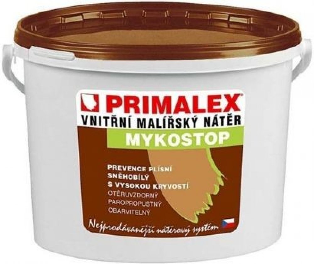 Primalex MYKOSTOP je speciální otěruvzdorný nátěr s velmi dobrou kryvostí, vysokou bělostí (min. 92% BaSO4) obsahující navíc účinné fungicidní látky, které likvidují plísně a současně mají i preventivní protiplísňový charakter.