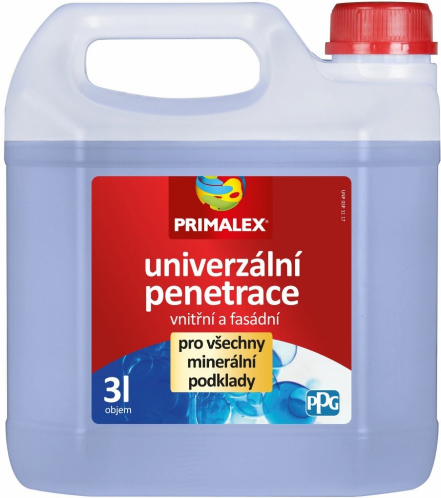 PRIMALEX UNIVERZÁLNÍ penetrace je širokospektrální vodou ředitelný penetrační prostředek s účinnou látkou na kopolymerní akrylátové bázi, určený ke snížení nasákavosti a spolehlivému zpevnění různorodých podkladních stavebních materiálů ve vnitřním i vnějším prostředí. Také výrazně zvyšuje přídržnost vrchních nátěrů k podkladu. Zpevňuje podklad, sjednocuje rozdílnou nasákavost různorodých materiál...