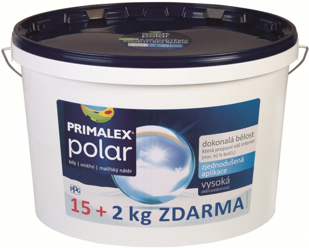 Primalex Polar nabízí dokonalou bělost, která projasní váš interiér. Díky pečlivému výběru nejkvalitnějších kalcinovaných vápenců a vysokému podílu titanové běloby můžeme garantovat nejvyšší stupeň "polární" bělosti (min. 92 % BaSO4). S Primalexem Polar získáte dojem většího a vzdušného prostoru vašeho interiéru. Splní tak i vaše nejnáročnější představy o exkluzivním matném vzhledu vašich stropů a stěn. Nová receptura zjednodušuje aplikaci a pomůže vám dosáhnout dokonalého výsledku. Primalex Polar je ideální pro malování stěn a stropů minerálních omítek i sádrokartonových desek interiérů v obytných a také komerčních prostorech, zejména reprezentativního charakteru. Svým jasně bílým tónem je vhodný také pro interiéry, které mají zvýšené požadavky na osvětlení. Specifikace: Doporučený počet vrstev: 2 Vydatnost v jedné vrstvě: 7-11 m2/kg Bělost: min. 92 % (BaSO4) Objemová hmotnost: 1,48 kg/l Odolnost proti otěru za sucha: stupeň 0 Přídržnost k betonu: min. 0,4 MPa Propustnost pro vodní páru: max. 0,07 sd(m) Obsah těkavých látek: max. 46 % Ředění 1. vrstva: max. 0-5 % vody (tj. max. 0,05 l na 1 kg barvy) Ředění 2. vrstva: max. 0-5 % vody (tj. max. 0,05 l na 1 kg barvy) Aplikace: štětcem, válečkem, stříkací pistolí