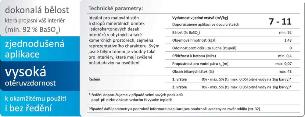Ideální pro malování stěn a stropů minerálních omítek i sádrokartonových desek interiérů v obytných a také komerčních prostorech, zejména reprezentativního charakteru. Svým jasně bílým tónem je vhodný také pro interiéry, které mají zvýšené požadadavky na osvětlení.