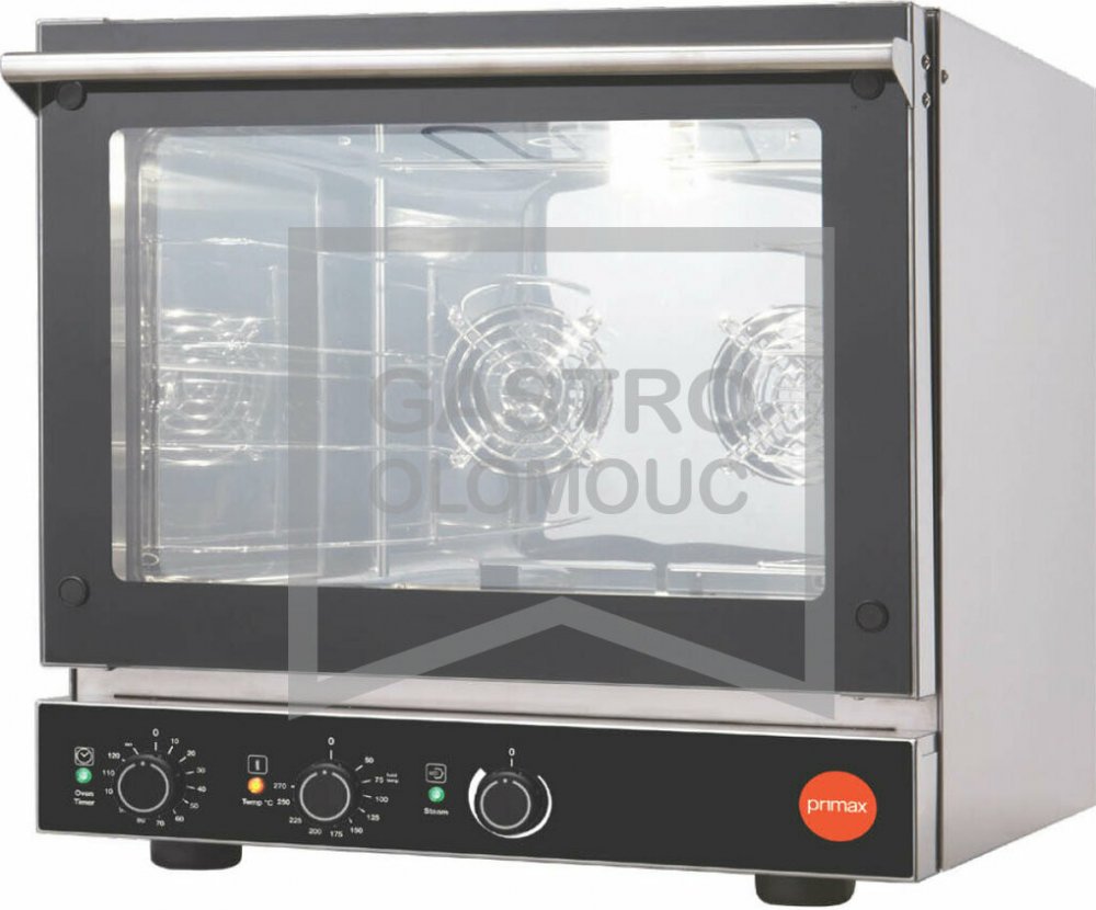 Pekařská a cukrářská pec Fast Value FV-SME404-LR řízené zvlhčování do komory (snadno regulovatelné zvlhčování) model umožňující připojení na vodu a odpad Pekařské a cukrářské pece předního Italského výrobce firmy Primax jsou vyrobeny v Itálii z evropských komponentů a kvalitní nerezových materiálů, sestaveny pod přísnou kontrolou v moderním funkčním designu. Pece FAST jsou ideálním řešením pro lehčí provozy k přípravě čerstvého, nebo zmraženého pečiva a dalších produktů. Pece jsou ideální pro kavárny, bary, rychlá občerstvení, čerpací stanice, plovárny. Celonerezové provedení AISI 430 (304), izolovaná komora (keramická vlákna), nerezový varný prostor (AISI 304) se zaoblenými hranami a lisovaným dnem. Snadné manuální ovládání s nastavení teploty 50°- 270°C, nastavením času 0 - 120 min. a trvalý chod (nekonečno). Model je v provedení se snadným "regulovatelným" zlhčováním (nastavení množství zvlhčování do komory) pomocí otočného ovladače. Dostatečný výkon a prodění vzduchu zajišťuje výkonný "reverzní" ventilátor (240W) a nerezová tělesa Incoloy 800 (3kW), vnitřní osvětlení komory. Snadno vyjímatelné těsnění varné komory. Odvětrávaná výklopná dvířka s dvojitým sklem a nerezovým bezpečné umístěným madlem. Nerez vyjímatelné zásuvy s roztečí 70 mm. Celonerezové provedení AISI 430 nerezový varný prostor AISI 304 se zaoblenými hranami izolovaná varná komora (keramická vlákna) snadné mechanické ovládání nastavení teploty 0-270°C nastavení času 0-120min + nekonečno mechanický regulátor pro nastavení zvlhčování do komory výkonný ventilátor s reverzním chodem vnitřní halogenové osvětlení snadno vyjímatelné těsnění varné komory odvětrávaná výklopná dvířka s dvojitým sklem nerez vyjímatelné zásuvy s roztečí 70mm kapacita komory pro 4 plechy 460x340 (na objednávku model se zásuvy pro GN2/3) model umožňující připojení na vodu a odpad přípojka na vodu (Ø 3/4" / 1,5-2 bar / trvdost 4-12°F) komora vybavena odpadní trubkou (odvod vody z komory).