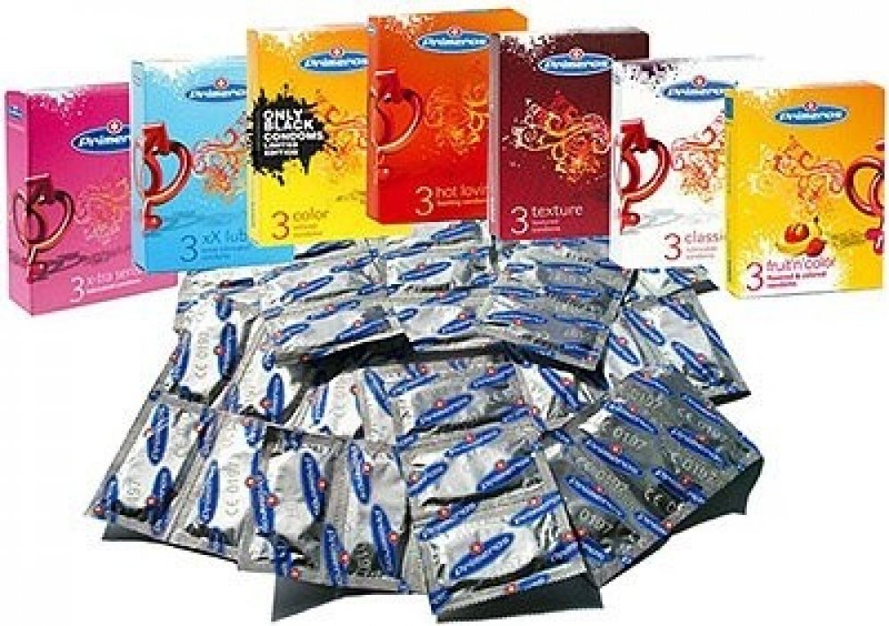 Balení 7 druhů nejprodávanějších Vitalis a Primeros kondomů spolu s dárkem. Primeros a Vitalis jsou v Německu vyrobené kondomy.