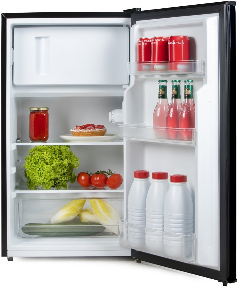Volně stojící jednodvéřová lednice o celkovém objemu 80 l s mrazákem uvnitř. Energetická třída E a praktická výška 83 cm.