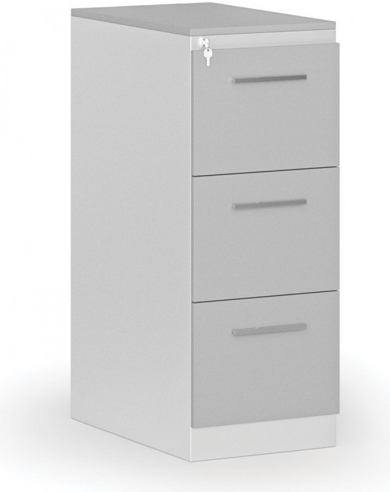 · korpus kartotéky z ocelového plechu se dvěma, třemi, čtyřmi nebo pěti zásuvkami pro formát závěsné složky A4 · čela a horní deska z laminované dřevotřísky tl.18 mm opatřeny hranou ABS tl. 1 mm · zásuvky jsou osazeny teleskopickými kuličkovými pojezdy se 100% výsuvem zásuvky pro snadnější práci s dokumenty · pojezd zásuvek je velmi lehký a tichý · nosnost zásuvky je 30 kg · systém blokace zásuvek zamezuje současnému vysunutí více zásuvek najednou a brání tak možnému převážení celé kartotéky · centrální zamykání kvalitním cylindrickým zámkem se dvěma klíči · povrchová úprava je provedena práškovým vypalovacím lakem v šedé (RAL 7035) nebo bílé (RAL 9003) barvě · dodávána v rozloženém stavu Důležité: Pro montáž produktu použijte pouze návod na montáž v elektronické podobě viz sekce "Návody"!