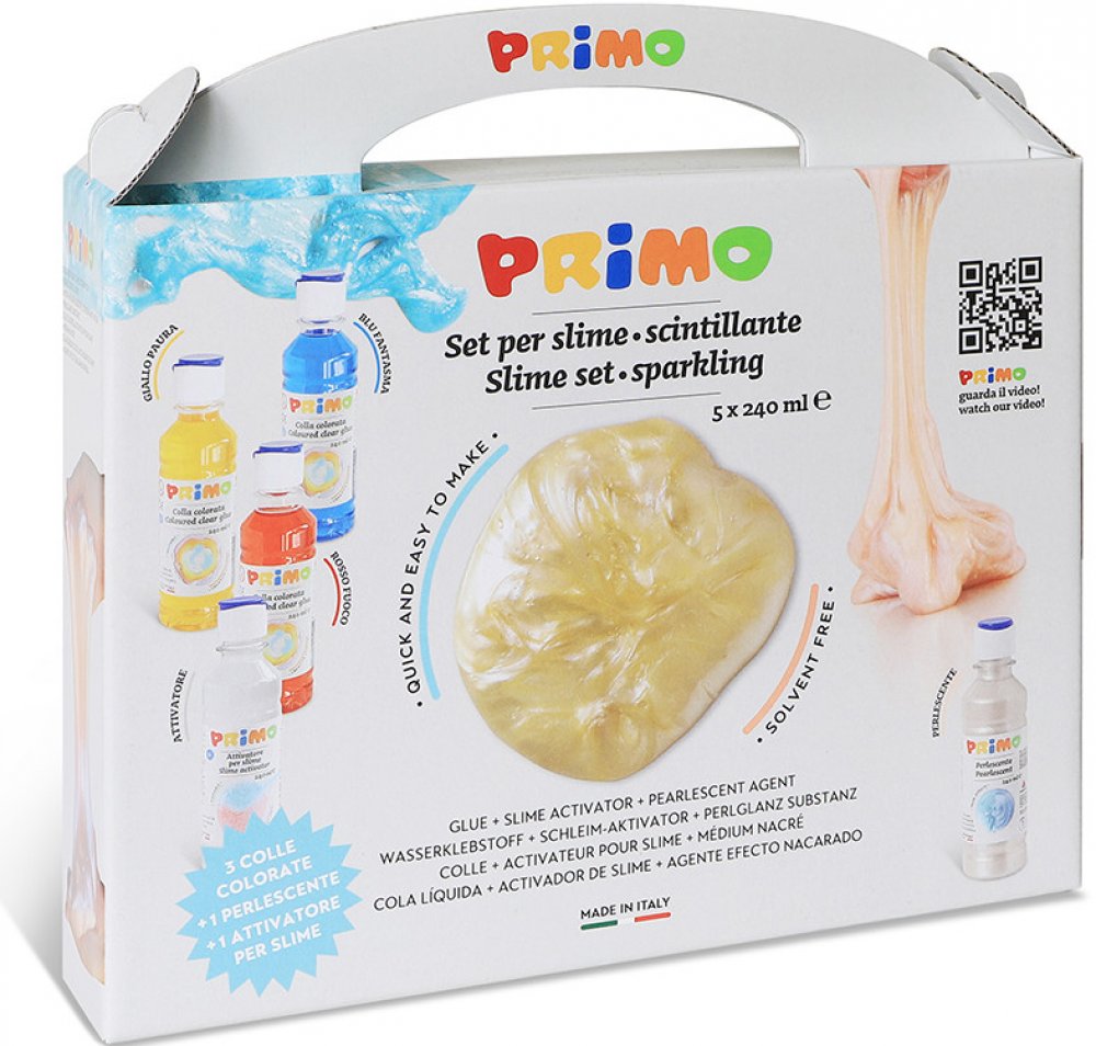 set 3 x barevné transparentní lepidlo na vodní bázi 240ml 1x aktivátor slizu 240ml 1x perleťové médium 240ml v pěkné papírové krabici vhodné jako dárek láhev s uzávěrem regulace průtoku Nalijte barevné lepidlo (např. 60 ml) do misky a přidejte několik kapek perleťového média (např. 6 ml) a mírně zamíchejte, přidejte trochu aktivátoru (např. 40 ml) a dobře promíchejte špachtlí, abyste získali pevnou texturu. Poté dokončete hnětením rukama. Doporučujeme umýt si ruce vodou a mýdlem před a po hraní se slizem. Uchovávejte sliz v uzavřené nádobě po dobu až 4/5 dnů. Poté zlikvidujte s běžným odpadem.