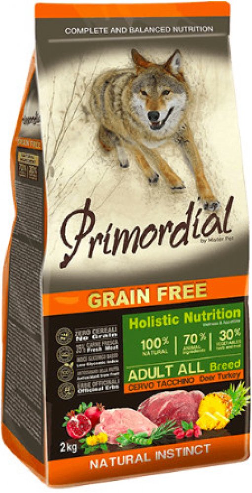 Primordial vysoká a krocan je kompletní vysoce stravitelné bezobilné krmivo bohaté na bílkoviny vysoké biologické hodnoty. Vysoká zvěř, striktně z volného výběhu, je neobvyklým zdrojem bílkovin, který představuje nízké riziko alergie a atraktivní chuť, kterou psi milují. Krůtí maso poskytuje lehce stravitelné bílkoviny a vhodnou kompozici aminokyselin. Ovoce a zelenina bohaté na vitaminy, minerály a fytonutrienty, trávicí vlastnosti ananasu, antioxidační funkce granátového jablka a šípku, podpora jater ze strany pampelišky a lněné semínko, kvalitní zdroj omega 3 mastných kyselin, dodávají tomuto krmivu dokonalou rovnováhu chuti a živin. Jedná se o skutečně holistický produkt, který aktivně přispívá k celkovému zdraví psa.