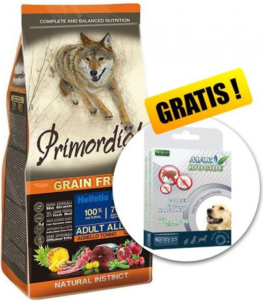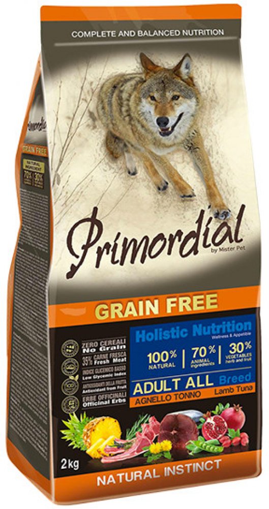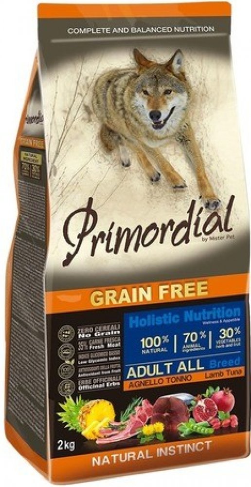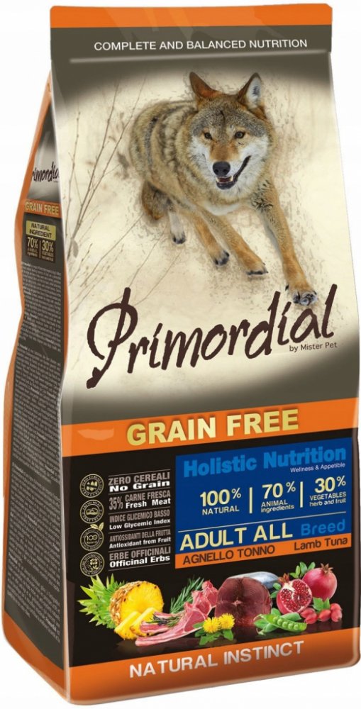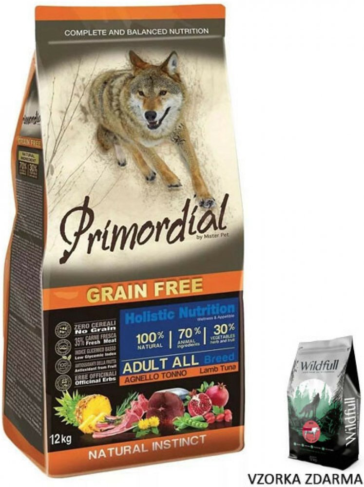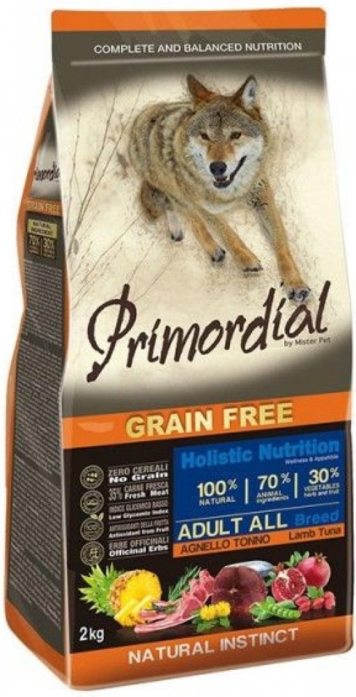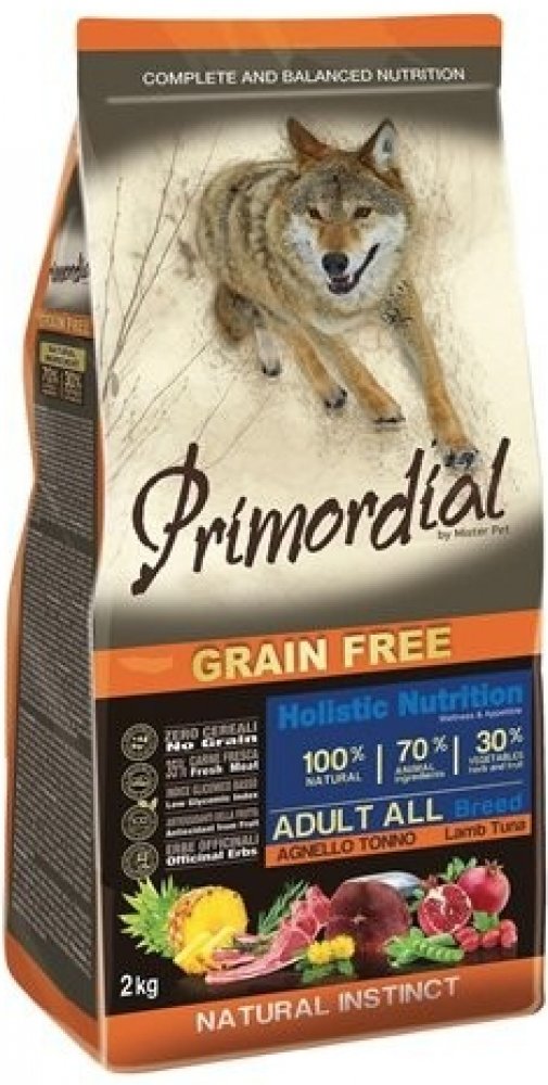 Primordial tuňák a jehněčí je kompletní bezobilné krmivo bohaté na proteiny vysoké biologické hodnoty a obsahuje vhodnou kompozici aminokyselin. Jehněčí maso, striktně z volného výběhu, poskytuje kompletní bílkoviny a atraktivní chuť, kterou psi milují. Tuňák nabídne snadno stravitelné bílkoviny a je bohatý na omega 3 mastné kyseliny, které vykonávají důležitou kosmetickou funkci pro kůži a srst a jsou velmi prospěšné pro kardiovaskulární systém (srdce a cévy). Ovoce a zelenina bohaté na vitaminy, minerály a fytonutrienty, trávicí vlastnosti ananasu, antioxidační funkce granátového jablka a šípku a podpora jater ze strany pampelišky dodávají tomuto krmivu dokonalou rovnováhu chuti a živin. Jedná se o skutečně holistický produkt, který aktivně přispívá k celkovému zdraví psa.