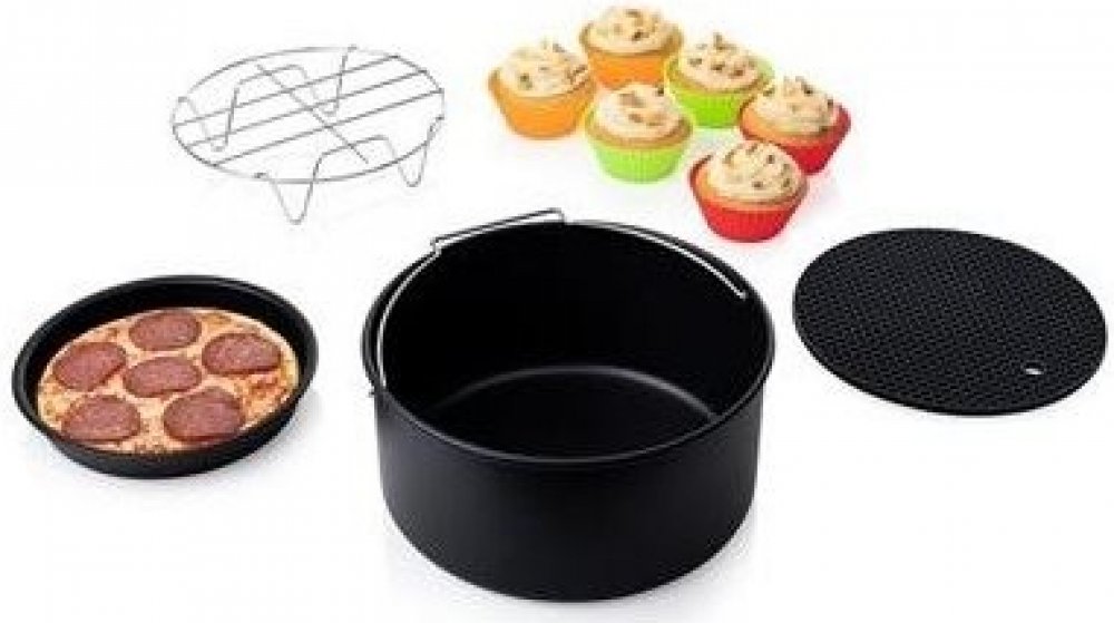 Vylepšete svou horkovzdušnou fritézu o sadu nepřilnavého příslušenství na pečení Princess 182011. Upečte si svou vlastní pizzu, koláč muffiny či cupcakes nebo si ugrilujte lososa se zeleninou. Sada obsahuje šest silikonových košíčků na muffiny, grilovací mřížku, plech na pizzu, kulatou formu na pečení a prkénko na hrnec. Příslušenství je určeno pro fritézy Princess 182020, 182021 a NOVA 180150 a l...