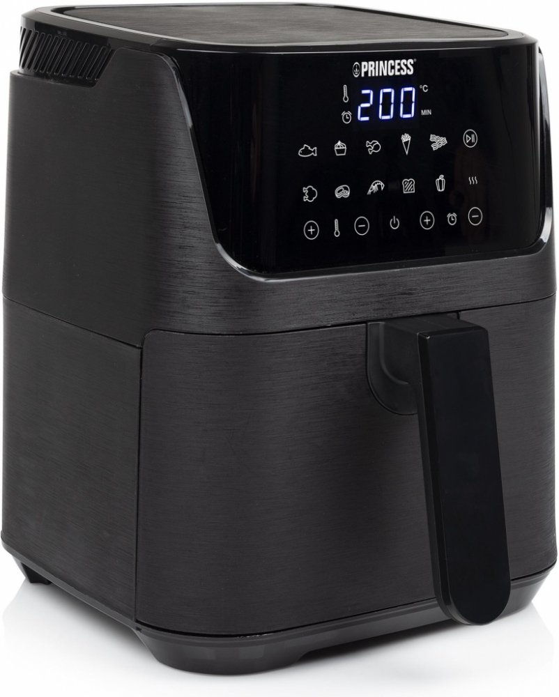 S digitální horkovzdušnou fritézou můžete smažit, péct, grilovat, vařit a opékat zdravá jídla pro celou rodinu. 3,5litrový objem umožňuje připravit až 5 porcí křupavých a lahodných hranolek najednou. Díky digitálnímu displeji a 10 předprogramovaným úrovním výkonu je příprava pokrmů v horkovzdušné fritéze snadná a zábavná. Její kartáčovaný černý kryt z ní dělá skutečný středobod každé kuchyně. Ještě nikdy nebylo tak snadné servírovat zdravé jídlo, které si zamiluje celá rodina. Díky jedinečné kombinaci horké konvekce a snadno nastavitelné teploty je příprava pokrmů s digitální fritézou XL zdravá a s nízkým obsahem tuku. Díky technologii High Speed Air Convention nepotřebujete k dokonalému a křupavému výsledku žádný tuk. Žádný olej také znamená žádnou námahu: fritézu můžete nechat v kuchyni pro každodenní použití. Díky přiložené brožuře s recepty můžete vytvářet ty nejlahodnější pokrmy! Vyjímatelný koš s cool-touch rukojetí umožňuje snadné a bezpečné servírování pokrmů. Díky protiskluzovým nožičkám je fritéza stabilní téměř na každém povrchu, takže se nemůže převrhnout ani sklouznout. Mezi další bezpečnostní opatření patří ochrana proti přehřátí, která zajišťuje, že se fritéza příliš nezahřeje. Pokud neznáte ideální teplotu a dobu přípravy vašich oblíbených pokrmů, žádný problém! Vzduchová fritéza má deset předprogramovaných stupňů výkonu, které umožňují zvolit a spustit správnou přípravu hranolků, masa, ryb, krevet, kuřete, steaků a koláčů pouhým stisknutím tlačítka. Pokud dáváte přednost vlastnímu nastavení teploty a doby přípravy, můžete využít snadno použitelný digitální ovládací panel s integrovaným časovačem. Takto můžete připravovat masové kuličky, rolády a quiche. Díky konvekčnímu ohřevu nepotřebujete k přípravě hranolků, masa, ryb a zeleniny téměř žádný olej. Pokud používáte čerstvé brambory, doporučujeme přidat lžíci oleje, abyste dosáhli křupavého výsledku. Horkovzdušná fritéza dokáže pokrmy i ohřívat, aniž by je vysušila, jako je tomu v případě mikrovlnné trouby. Princess 182031. typ produktu de: Objem: 3,5 l, Teplota (max.): 200 °C. Typ konstrukce: Barva výrobku: černá, Provozní režim: Barva: dotyková. Typ displeje: LCD. Příkon: 1350 W, Vstupní napětí AC: 240 V, Vstupní frekvence AC: 50 - 60 Hz