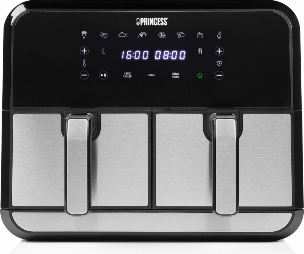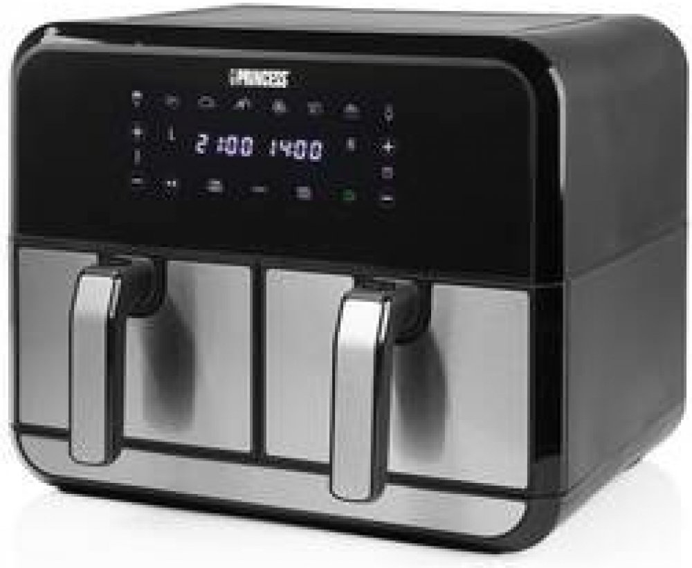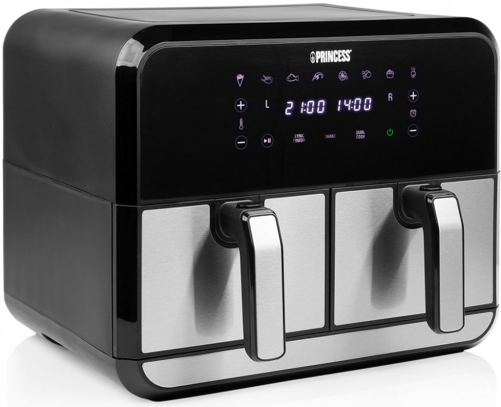 Horkovzdušná fritéza PRINCESS 182074 Nabízí 2 koše, které lze nastavit jak nezávisle na sobě, tak současně Velký objem pro přípravu jídla pro celou rodinu díky objemu 8 l (2x 4 l) Celková kapacita až 2 kg potravin Příprava chutných pokrmů bez použití oleje nebo jiného tuku Elegantní design v kombinaci černé a nerezu 8 přednastavených programů: hranolky, steak, ryba, krevety, pizza, kuřecí stehna, ...